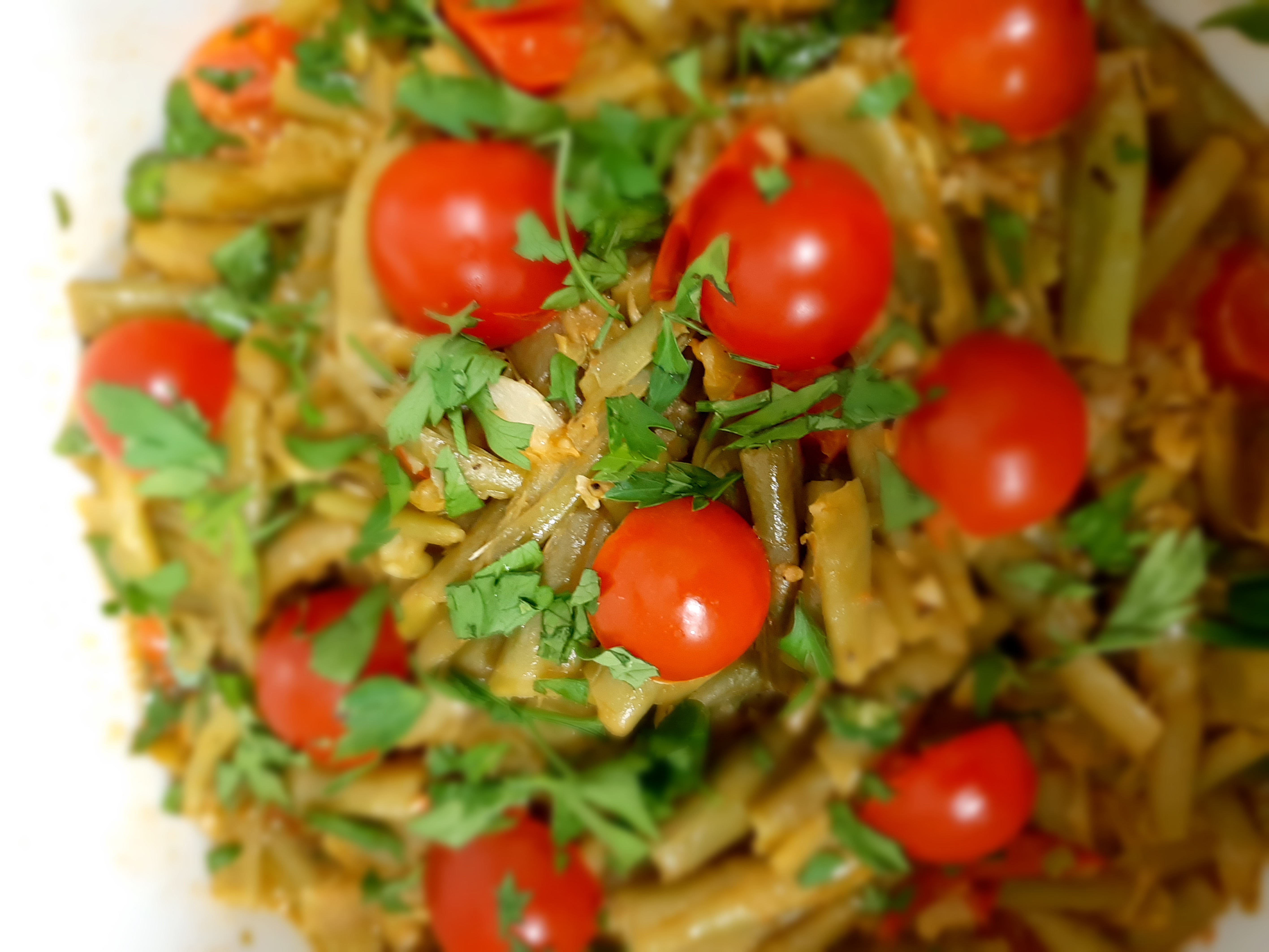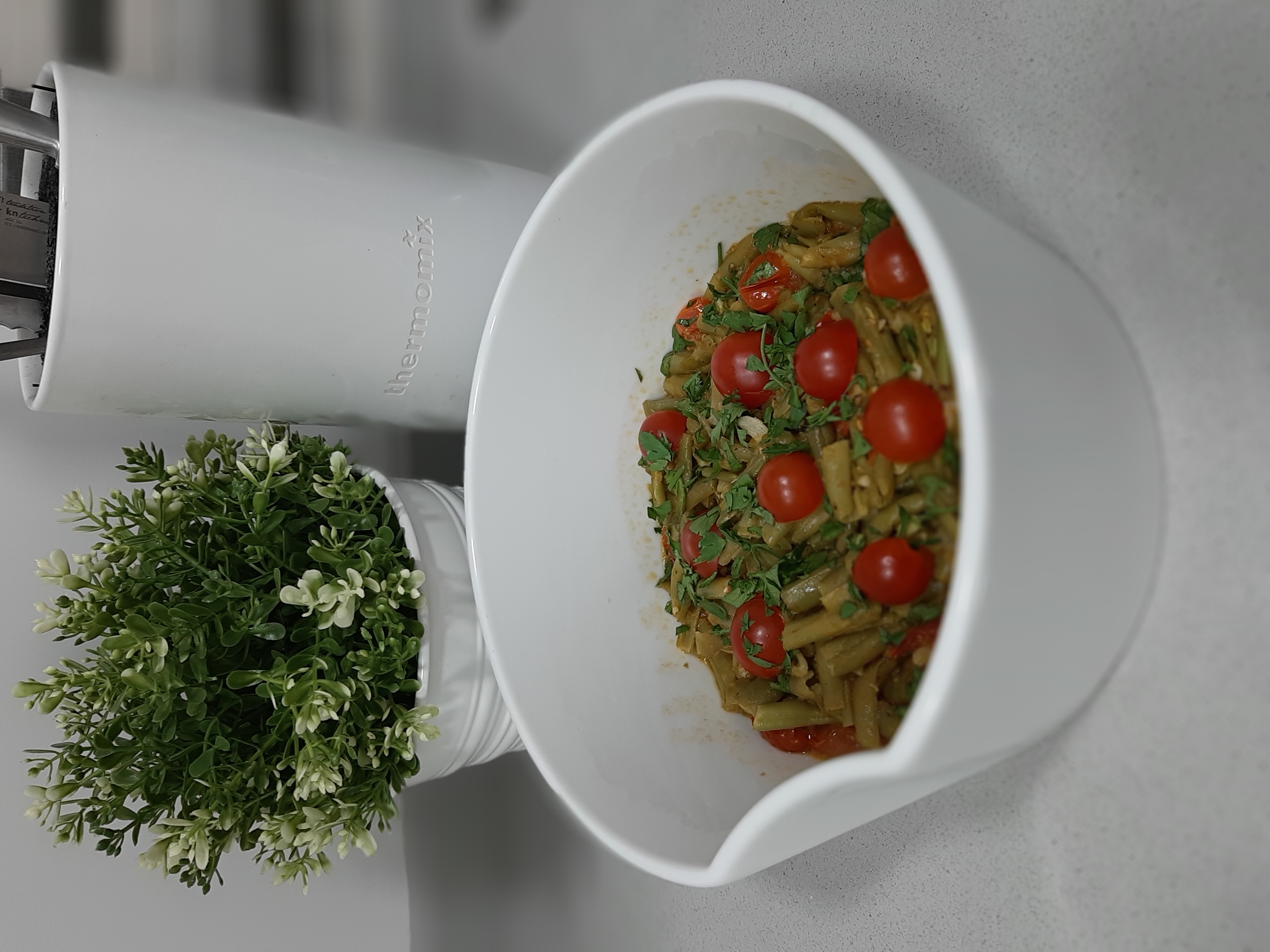 3 Añada las judías verdes cocidas y escurridas, los tomates cherry , el orégano, la sal el azúcar y la pimienta y sin poner cubilete saltee 3min/Varoma/giro inverso/velocidad cuchara sirva espolvoreado con el perejil.