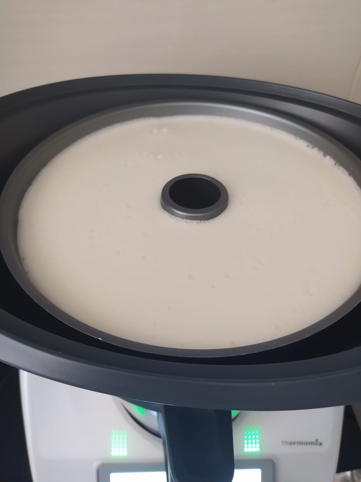 - Pon en el vaso la vaina junto a la leche y lleva a ebullición, 10 min/100ºC/vel 2. Cuidado cuando empieza la ebullición, sube muy rápido, ve mirando quitándole el cubilete (porque no es lo mismo que la leche este de la despensa a que esté del frigorífico). Raspa la vaina y retira la rama.
