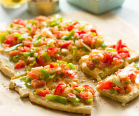 6-Coloque la masa en una bandeja de horno o molde de pizza engrasada con aceite y extienda con las manos aceitadas o un rodillo dejándola muy fina, coloque sobre la masa el sofrito de pimiento verde, distribuya las rodajas de calabacín, las tiras de pimientos rojos y riegue con un chorrito de aceite virgen. Hornee durante 10 o 12 minutos a 200ºC.