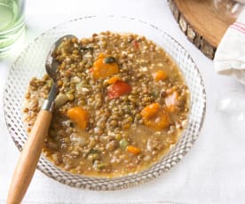 2- Añada la patata, la zanahoria, el pimentón, el laurel, la sal, las lentejas y el agua y programe 15 minutos, temperatura Varoma, giro a la izquierda, velocidad cuchara.