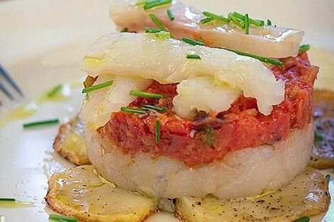 1-En una ensaladera separe lascas de merluza en un plato, coloque un aro de emplatar, cubra el fondo del aro con lascas de merluza, extienda dos cucharadas de tomate frito y cubra con otra capa de lascas de merluzas termine de con mayonesa.