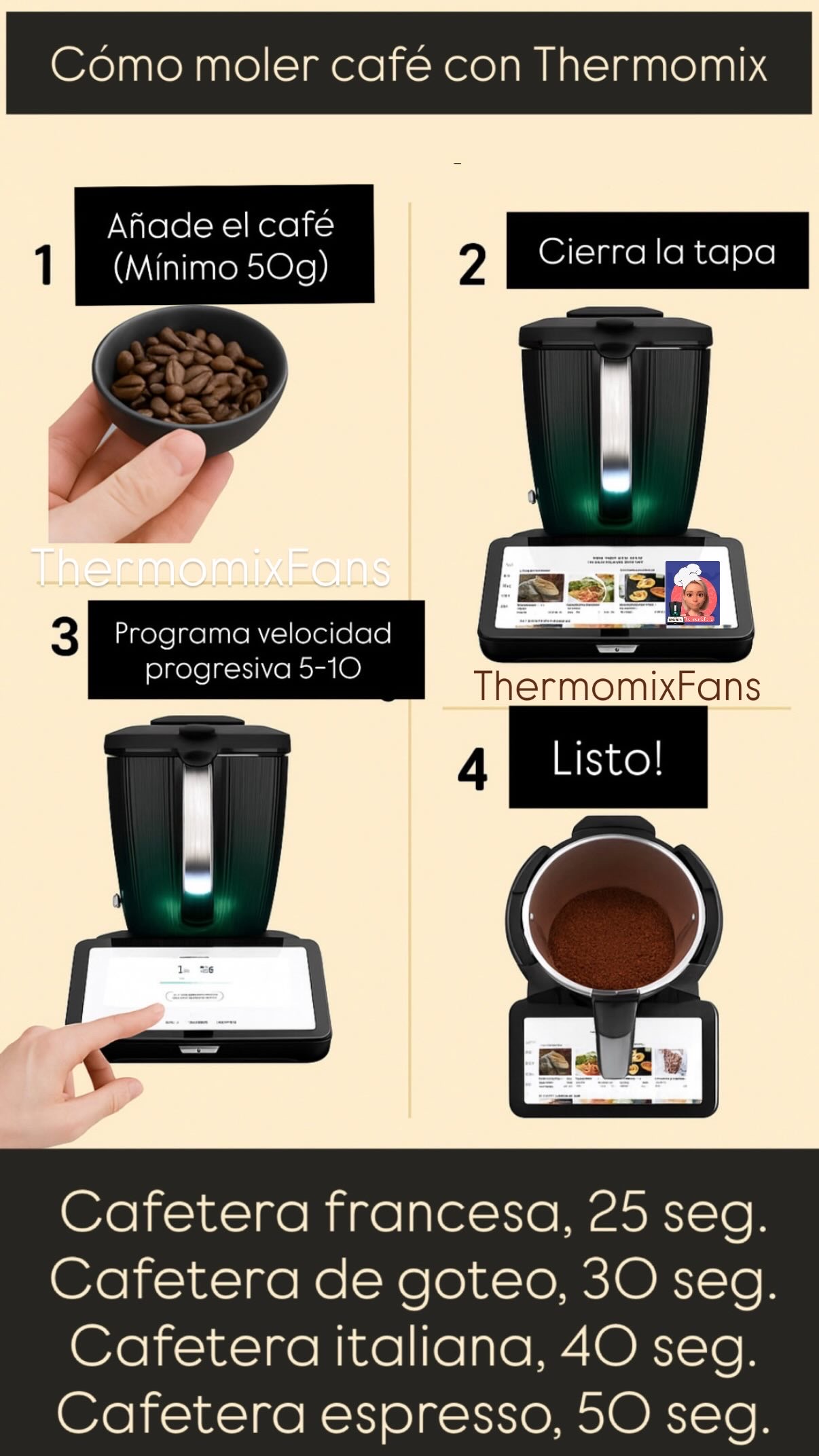 En esta imagen te explico cómo moler café con Thermomix según el tipo de cafetera y resultado que busques.