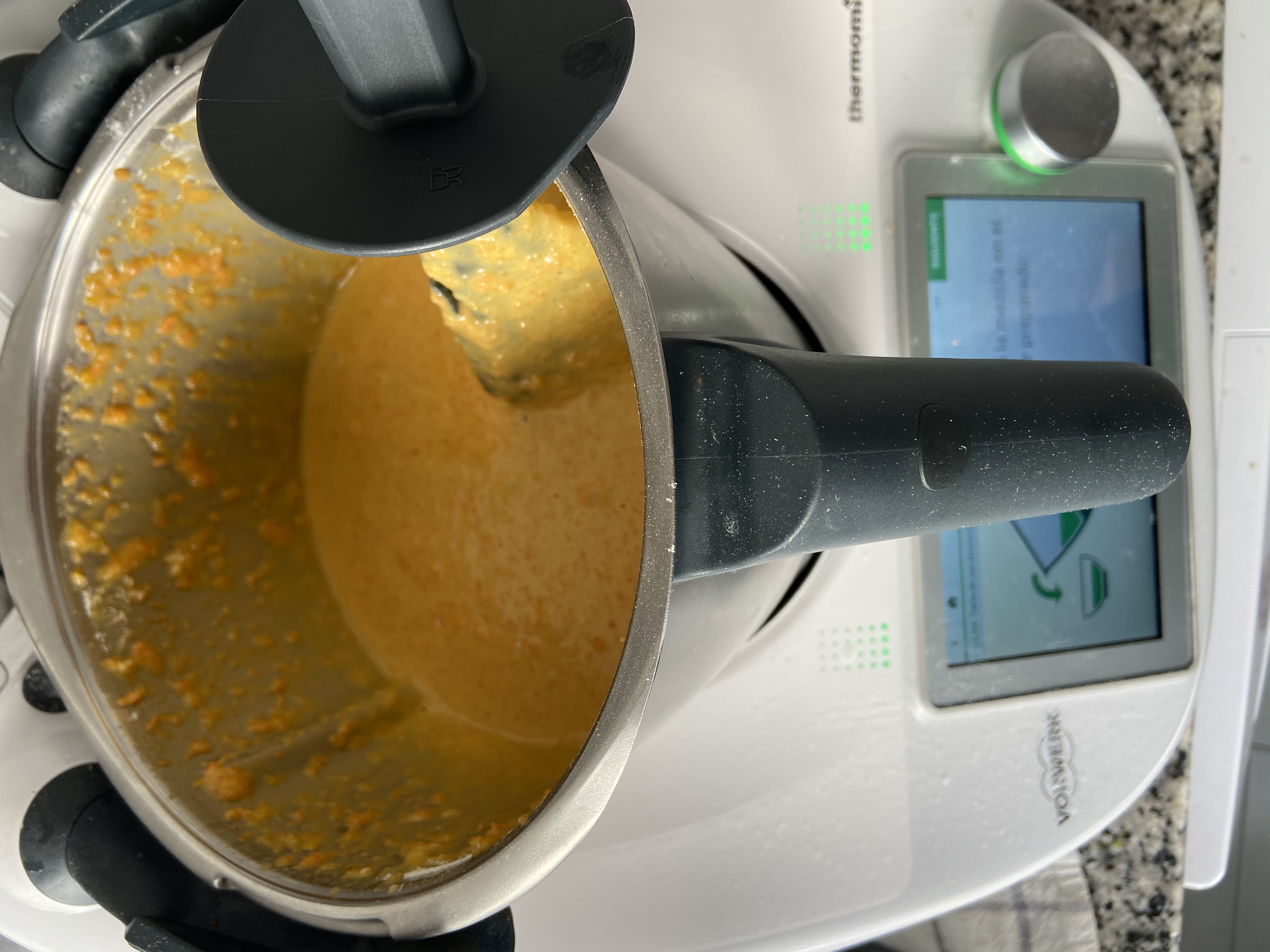 - Añade la zanahoria y tritura 5 seg/vel 5. Comprueba al final que se haya triturado bien la zanahoria, dependiendo del tamaño de los trozos podrías necesitar volver a programar otros 5seg/vel 5.