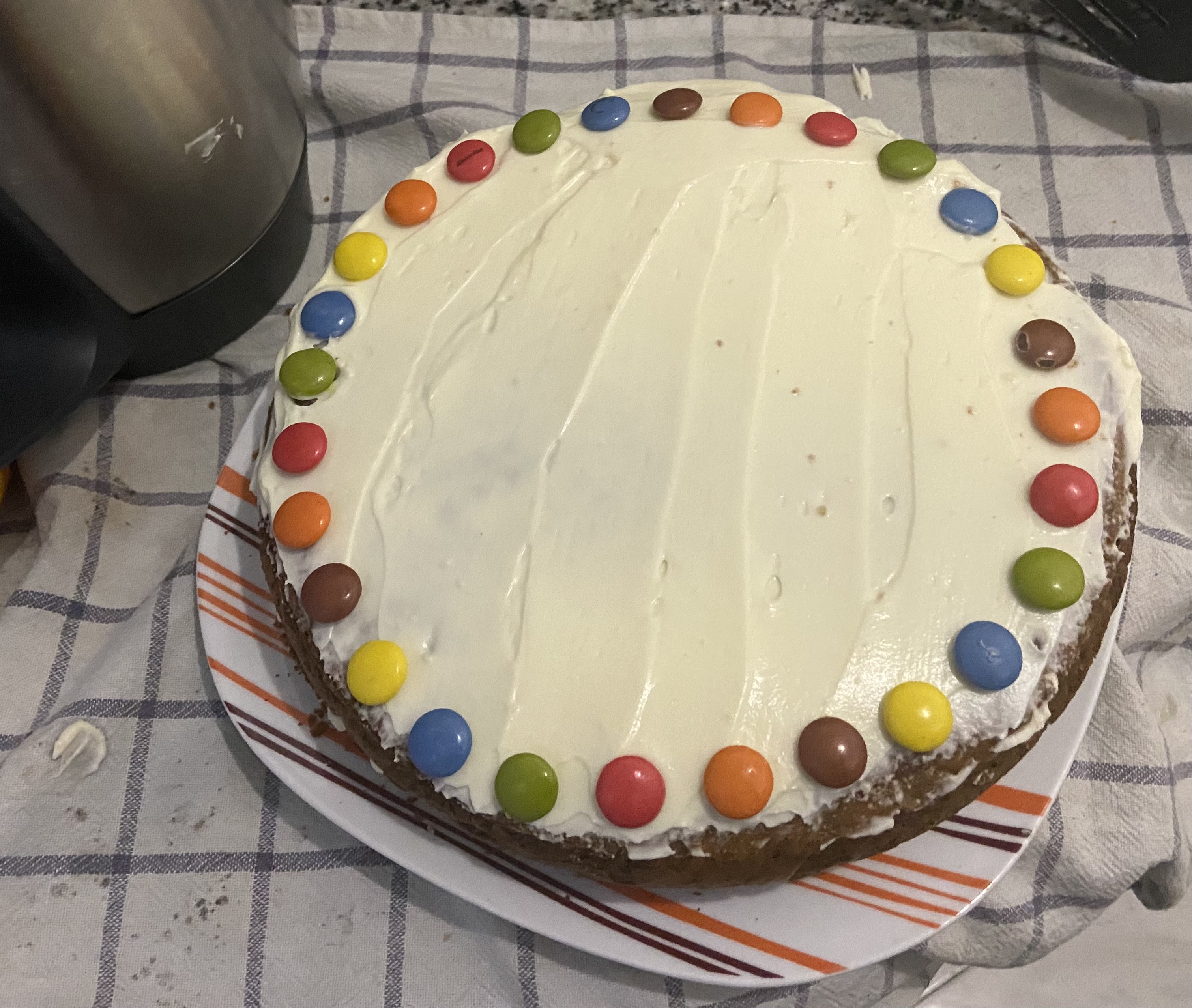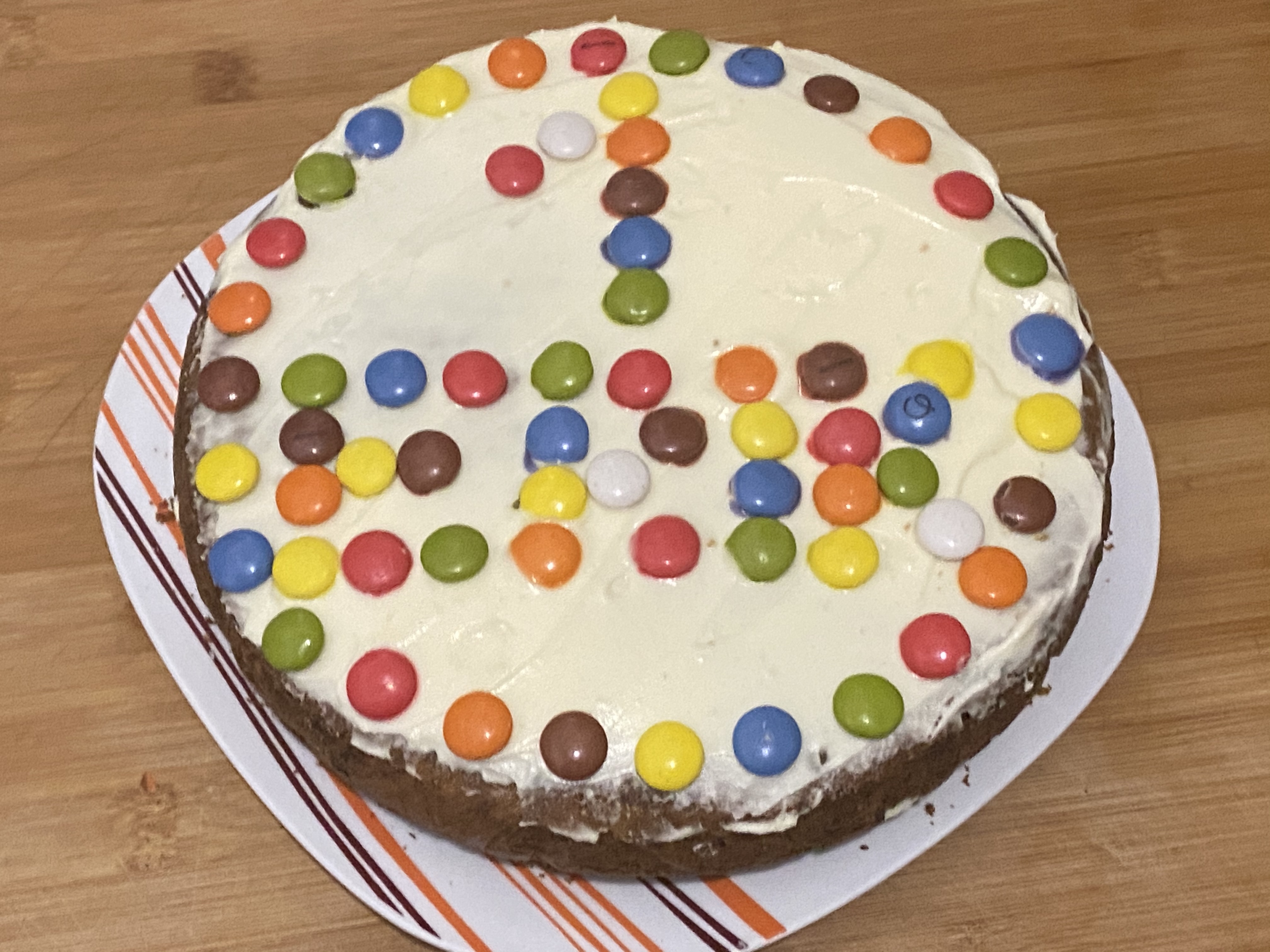 - Comienza a decorar. En mi caso, he utilizado Lacasitos, pero podrías escribir utilizando una manga pastelera de boca fina.