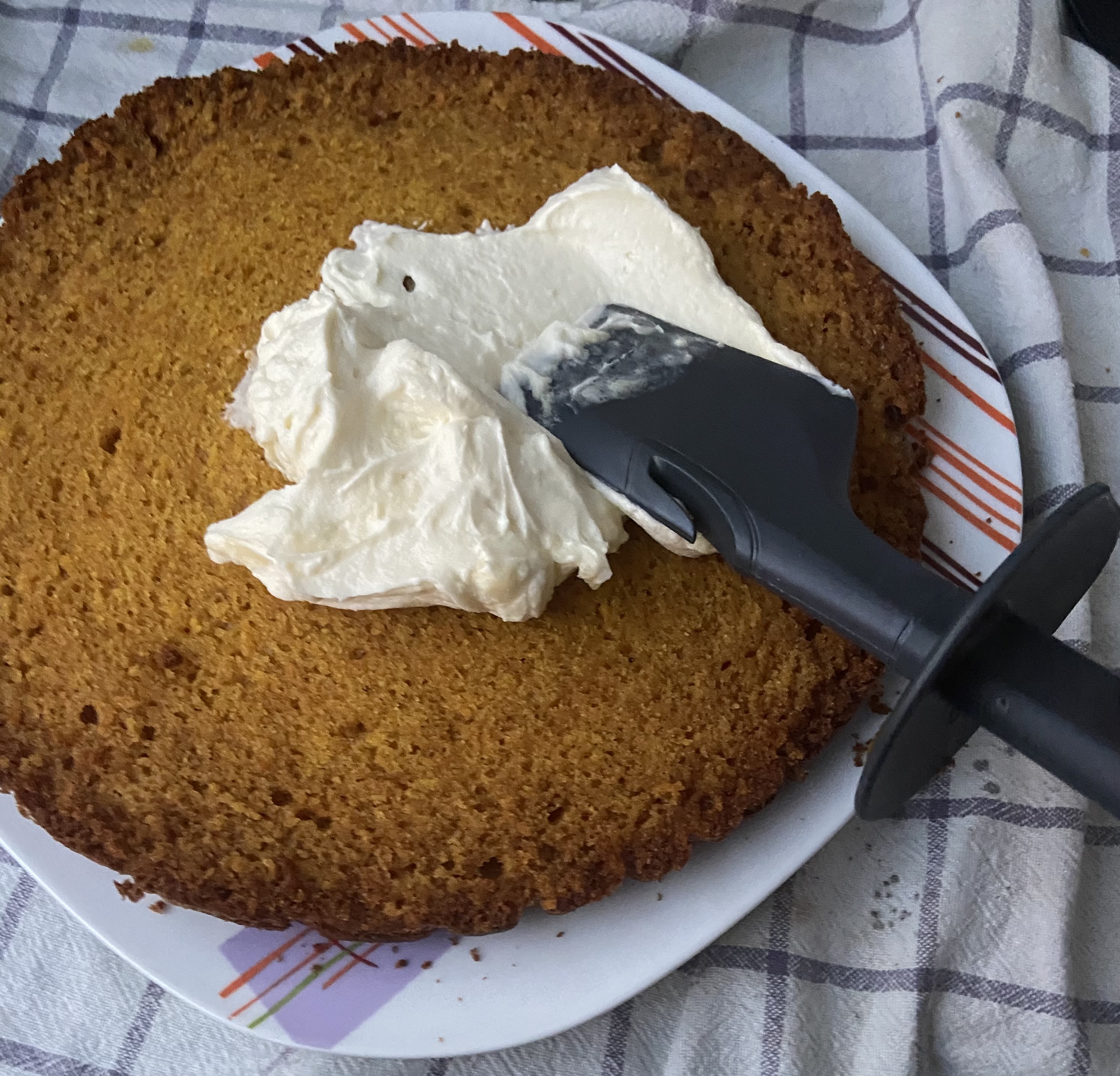 - Pon encima la otra parte del bizcocho y cúbrela con el frosting. Puedes utilizar la espátula u otra espátula para que quede bien uniforme.