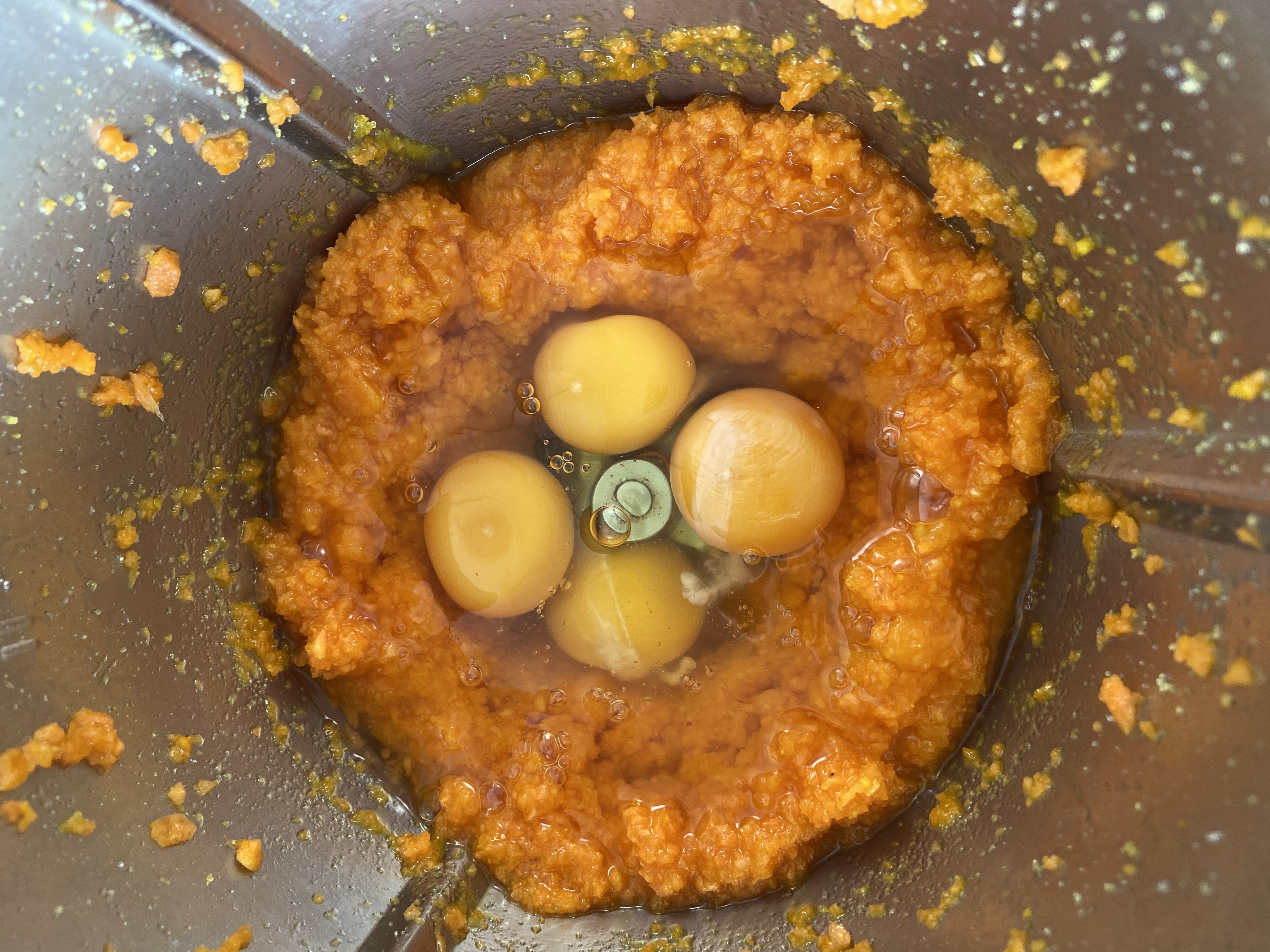 - Agrega los huevos, el aceite de girasol y mezcla 30 seg/vel 5.