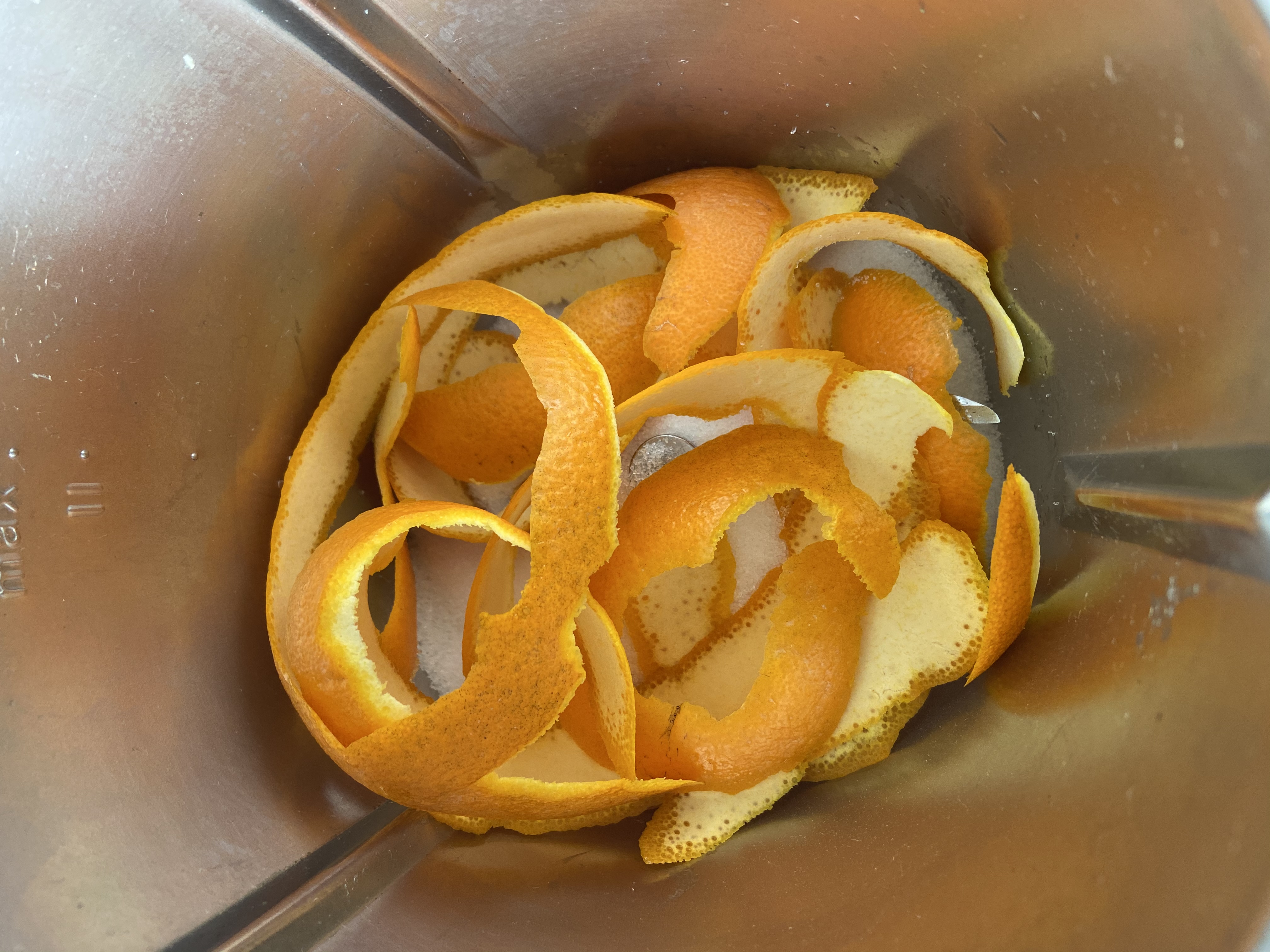 - Pon en el vaso el azúcar y la piel de naranja y pulveriza 20 seg/vel 10. Se creará una Azucar afrutado maravilloso.