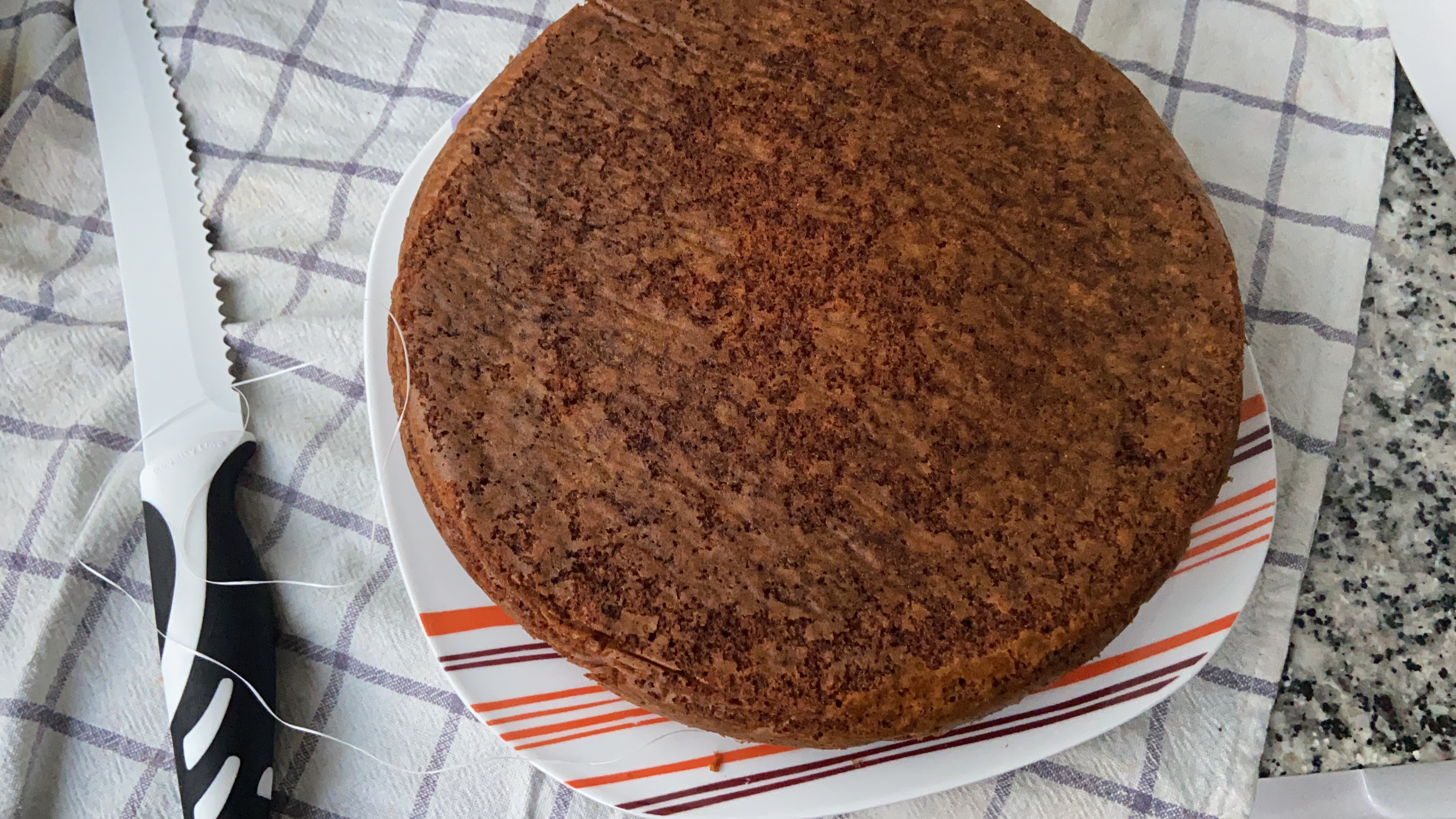 - Corta el bizcocho por la mitad. Te aconsejo SOLO marcar con un cuchillo por el exterior y utilizar un hilo para cortarlo. Enrollando el bizcocho y trayéndolo hacia a ti. Es muy sencillo y el resultado es perfecto.