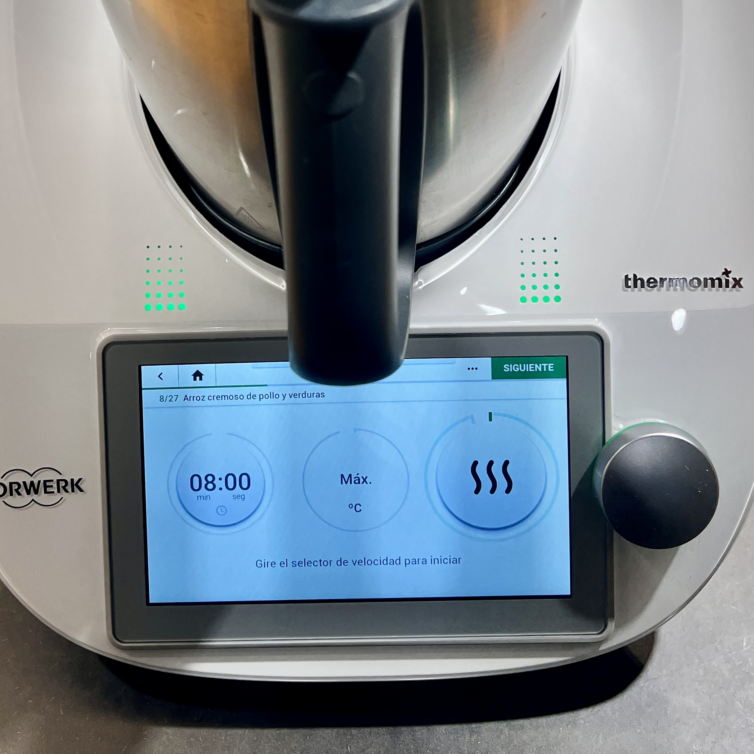 Al usar la alta temperatura y por motivos de seguridad, la pantalla nos indicará que coloquemos la rejilla antisalpicaduras, que es un accesorio exclusivo del Thermomix® TM6. Se coloca sobre la tapa del vaso y al cerrarse los brazos queda bloqueada y no se puede quitar durante el uso del modo. Como su nombre indica sirve para evitar posibles salpicaduras, principalmente de aceite o toffees a alta temperatura. La Cocina guiada indicará el momento en el que debe utilizarse y será necesario confirmar que está colocada a través del mensaje que aparece en la pantalla.. Si no le indicamos en la pantalla que está colocada, la receta retrocederá un paso y no permitirá continuar hasta que se confirme que está colocada.