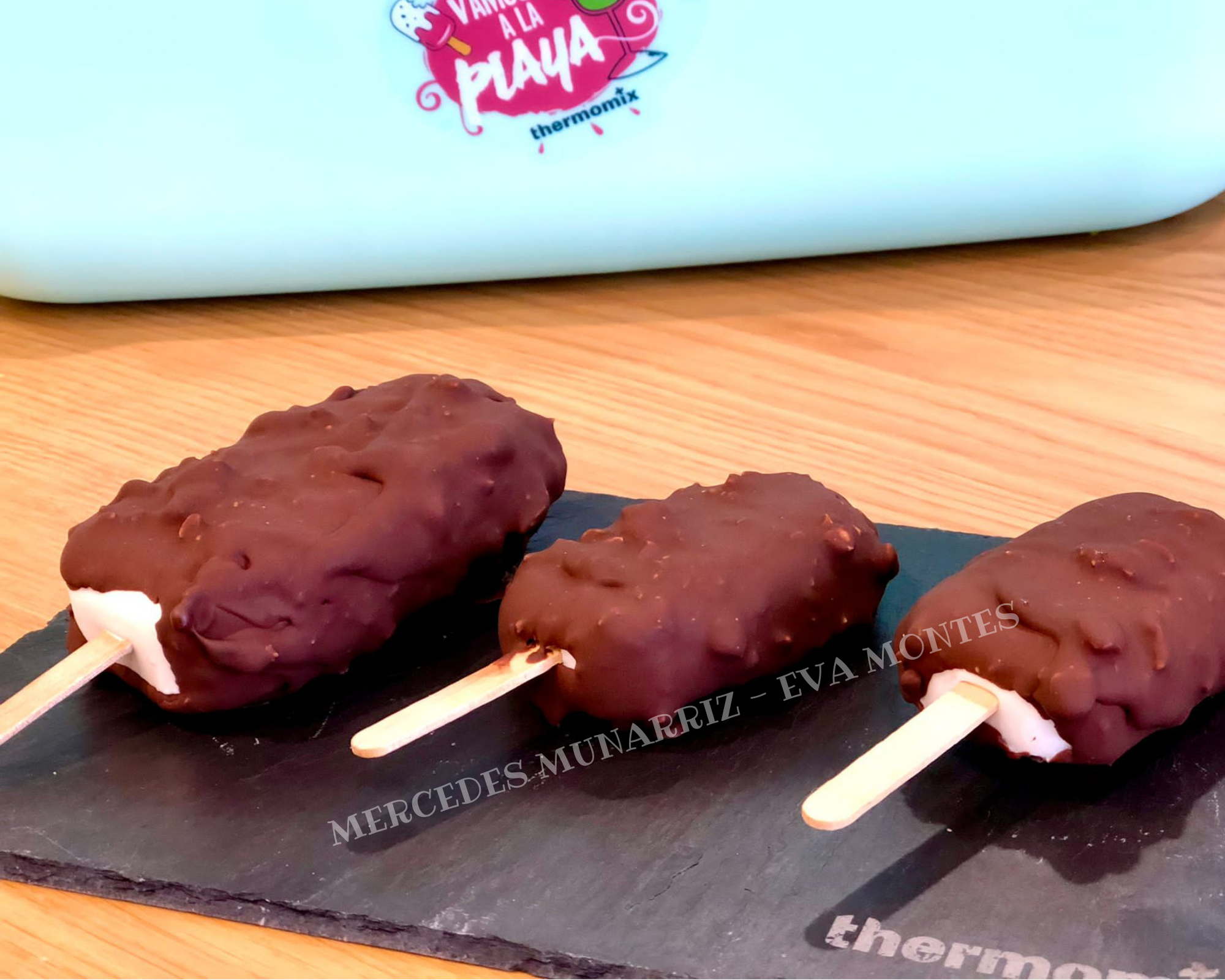 - Bañamos los helado en la cobertura de chocolate y volvemos a meter en el congelador hasta 5 minutos aproximadamente antes de consumirlos.