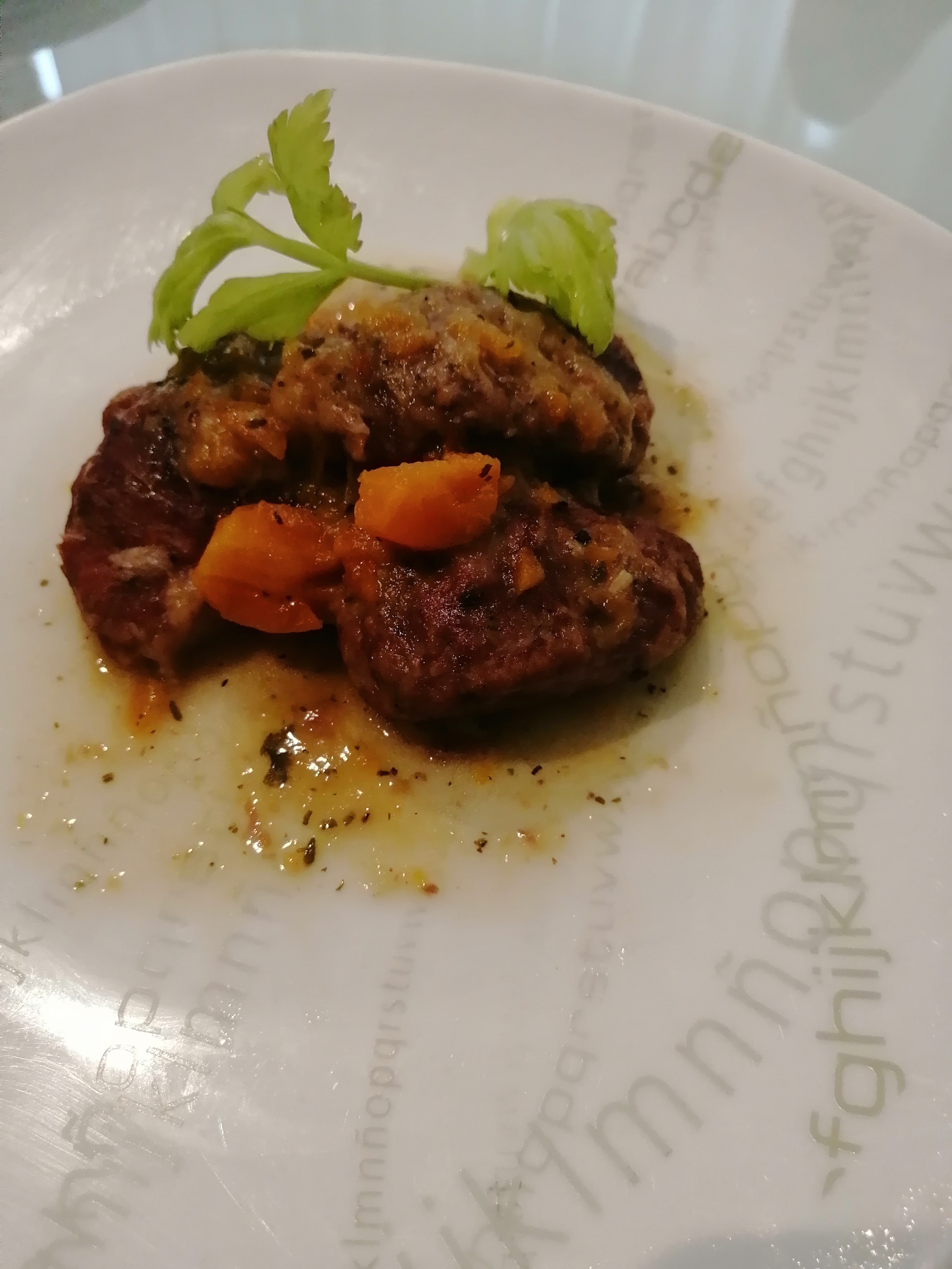 Receta basada en la experimentación y elaboración clásica de carrilleras en salsa a la antigua, fusionada con la técnica del cocinado al vacío, a baja temperatura.