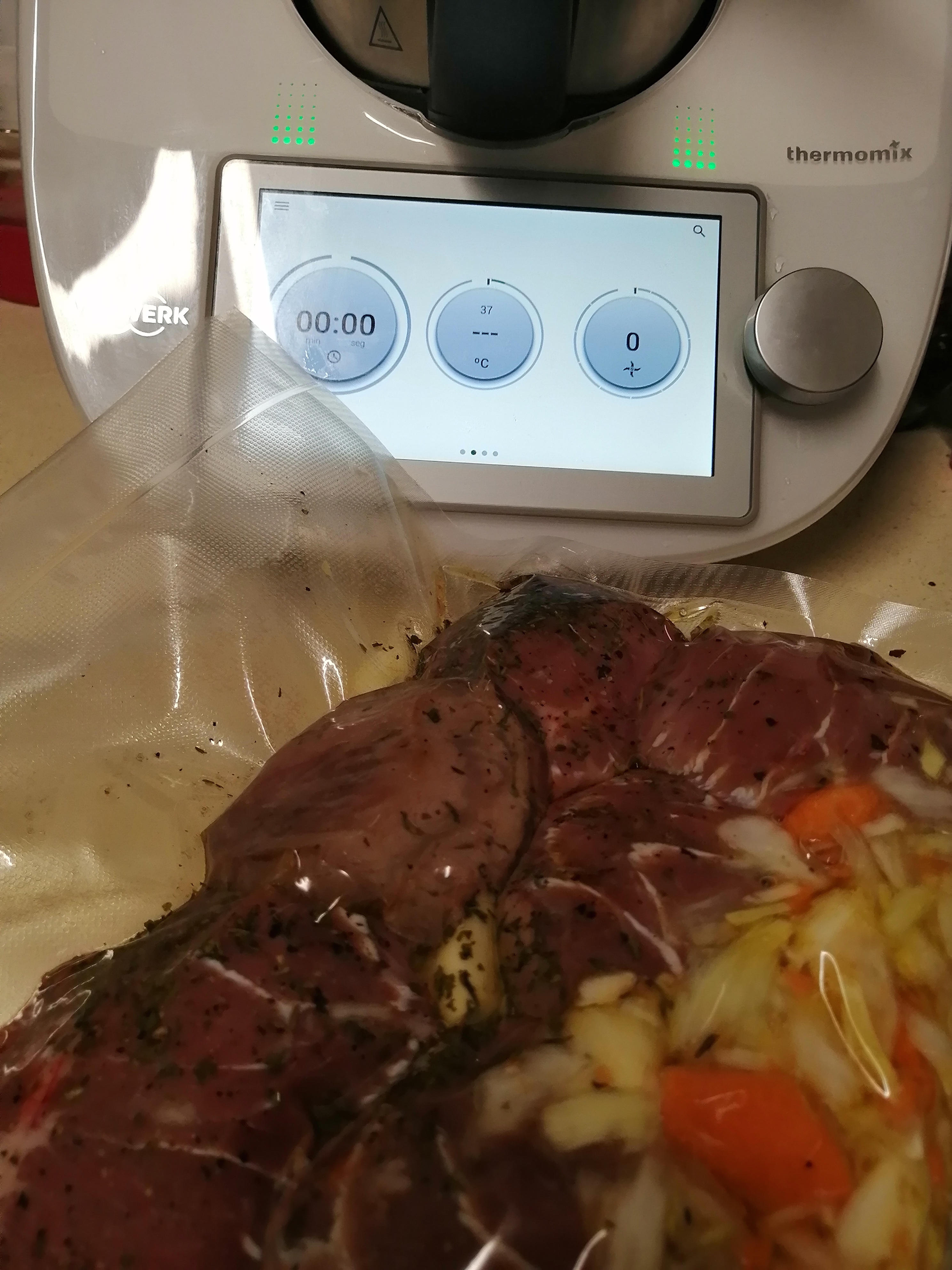 - Seleccionar, en el panel de funciones, el icono del cocinado "Al Vacío" y programar 10 horas, 65º y activar el proceso de cocinado (lo ideal es que este paso se haga durante la noche para seguir con la receta y finalizarla al día siguiente)