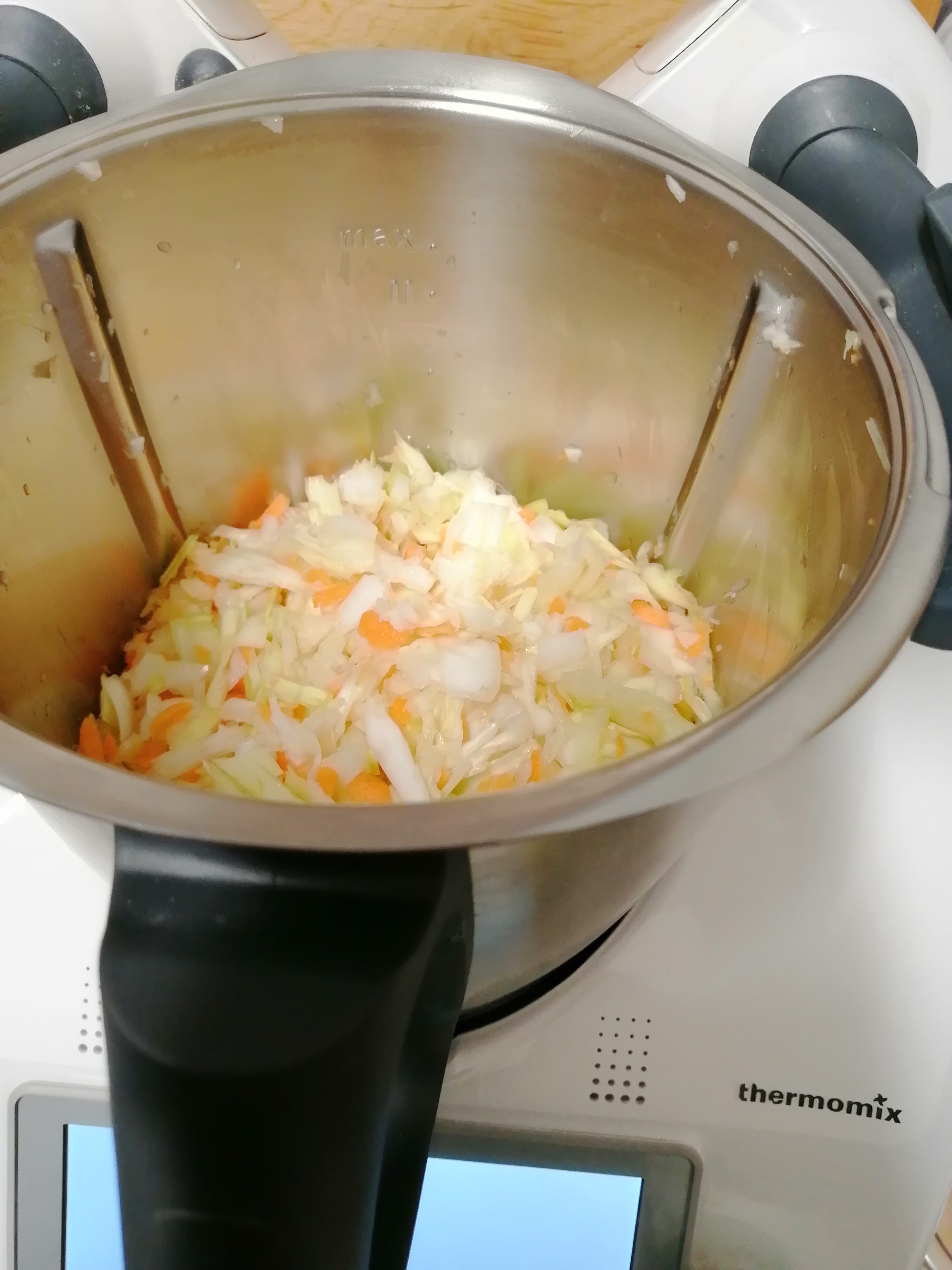 - Con el vaso limpio, poner toda la picada de verduras reservada, el diente de ajo y el aceite restante de haber sellado la carne y sofreir durante 12 minutos, 120º, Velocidad 1, Giro Inverso
