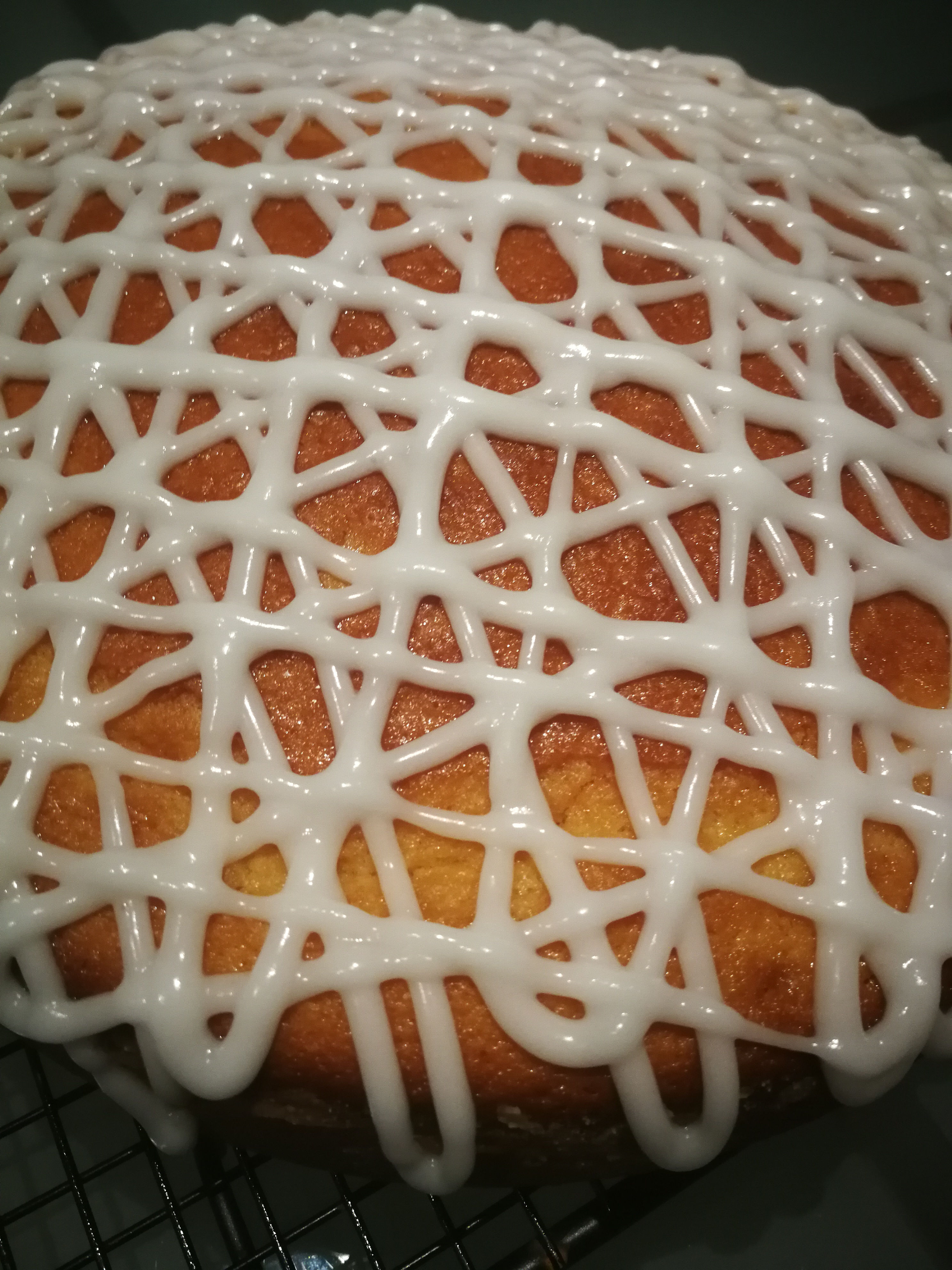 - Una vez frío, decoramos con el glaseado (que lo hemos elaborado mezclando bien el azúcar glass con el zumo de limón)