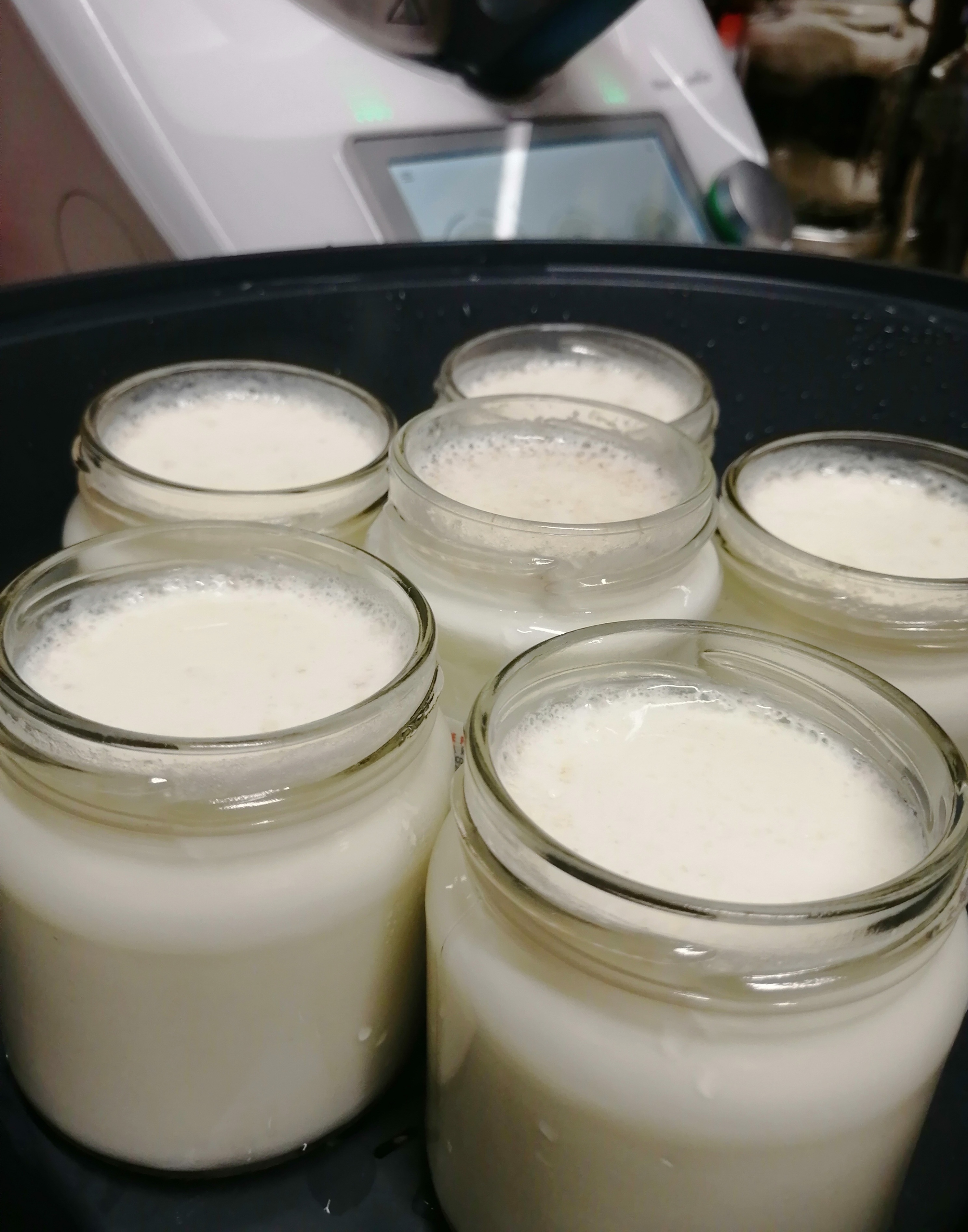 TM6: Colocar los vasitos llenos sin las tapas en el recipiente Varoma, tapar el Varoma, echar 500gr de agua y el zumo de medio limón en el vaso y colocar el Varoma tapado en su posición (encima de la tapa del vaso). Seleccionamos la función FERMENTACIÓN, y programamos 8 horas a 70º. Una vez comenzado el proceso, no debemos mover los vasos. Al finalizar el tiempo, tapamos los vasitos con sus tapaderas y los guardamos en el frigorífico hasta el momento de consumir