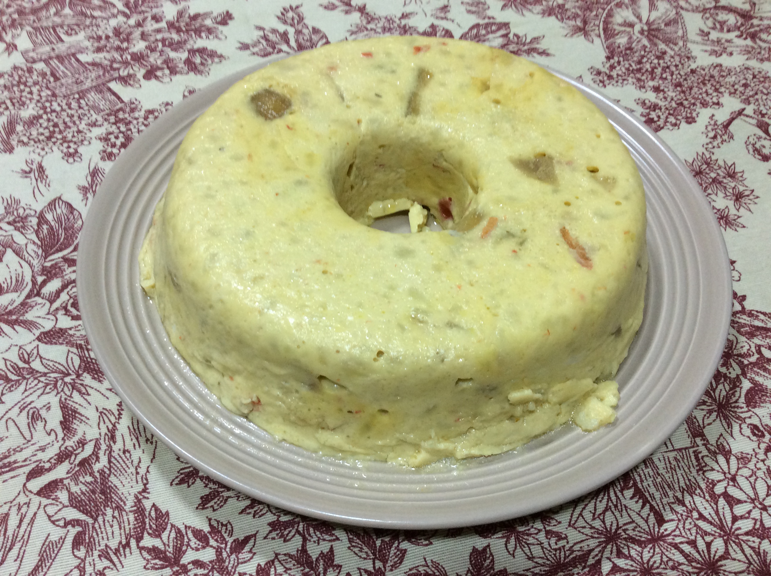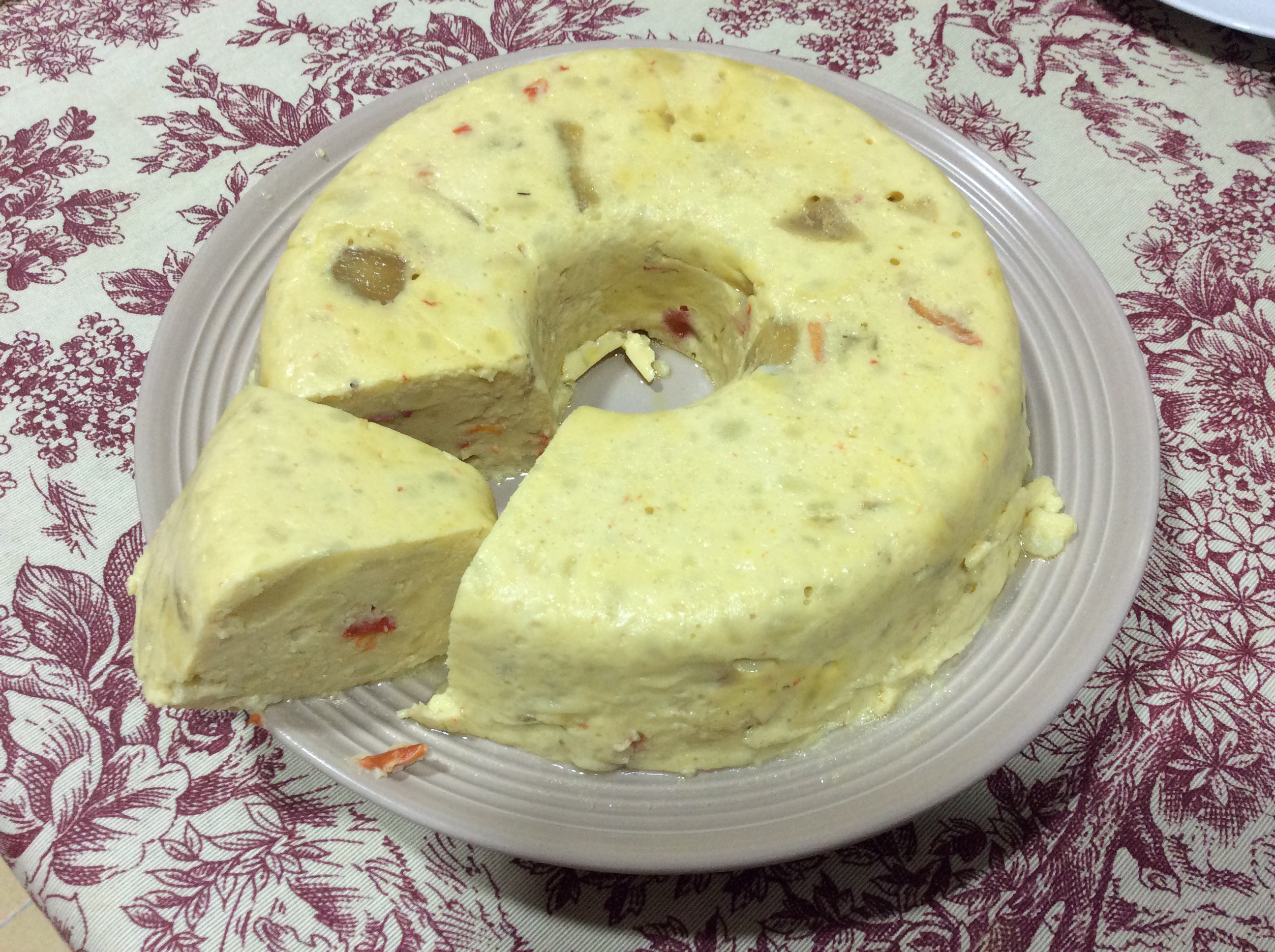 A continuación lo añadimos al bol donde teníamos reservado las patatas y los huevos y todo lo vertemos en un molde corona bien engrasado con aceite de oliva. Lo colocamos en el recipiente Varoma . En el vaso añadimos un litro de agua o aprovechamos para hacer en el vaso una crema de verdura . El tiempo que tiene que permanecer la tortilla en el Varoma, para que cuaje es 45 min.