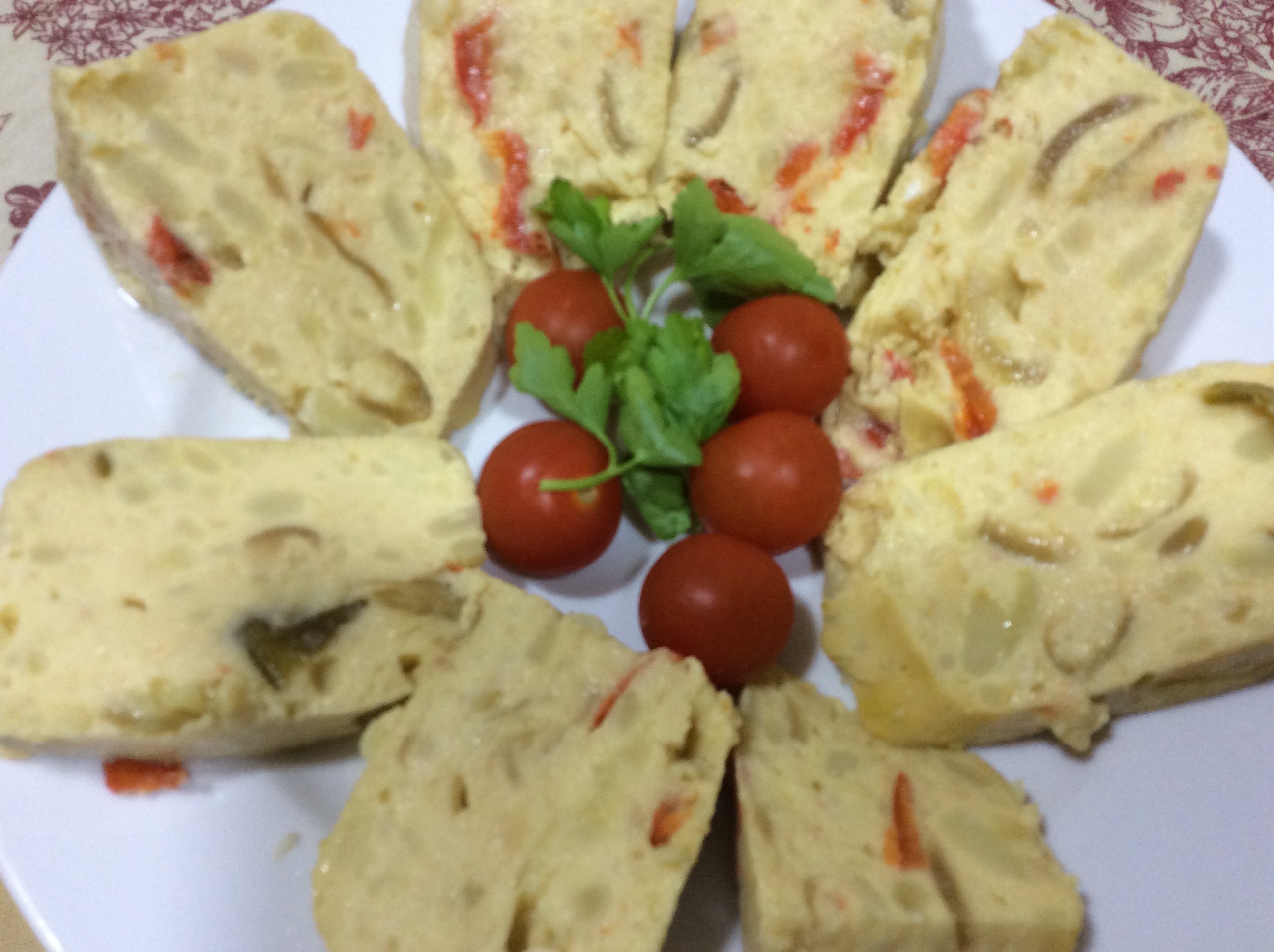 Tortilla de patatas con pimientos y cebolla dorados