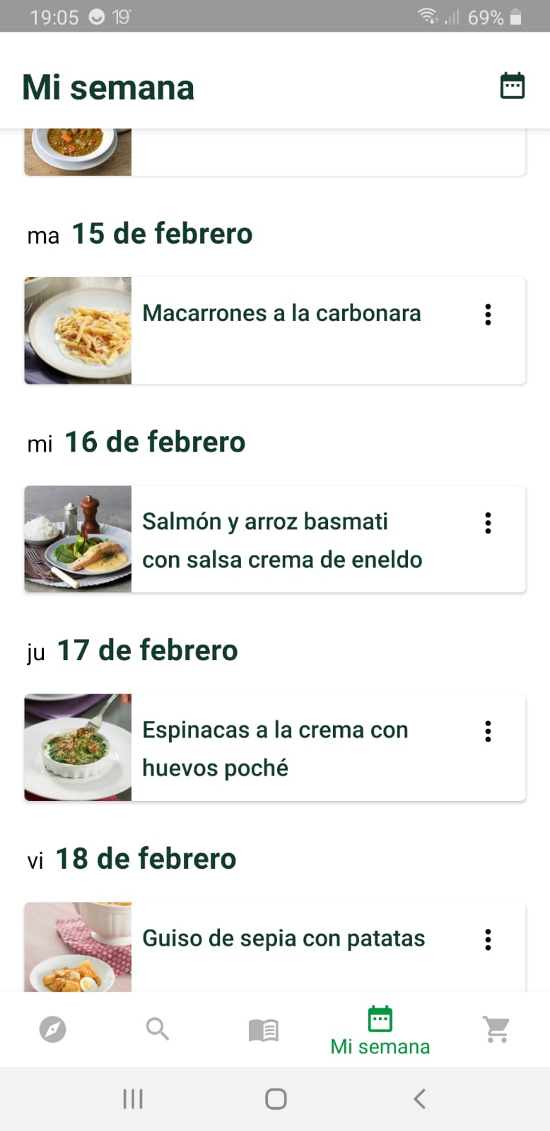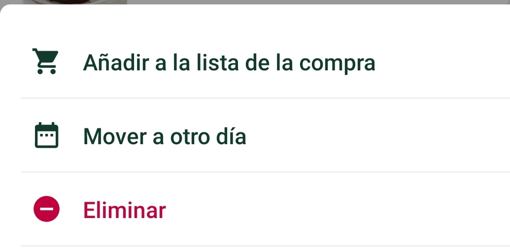 Una vez planificada la semana, si decidimos cambiar el día que ya habíamos seleccionado , pincharemos en los tres puntitos que aparecen a la derecha y nos mostraría la opción de: añadir a la lista de la compra, mover a otro día ó eliminar.