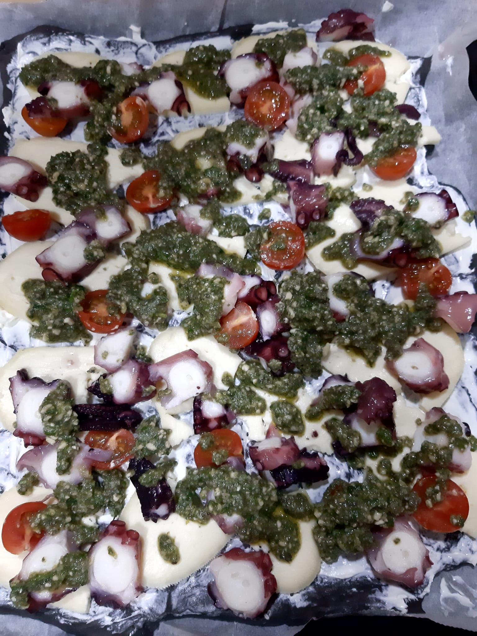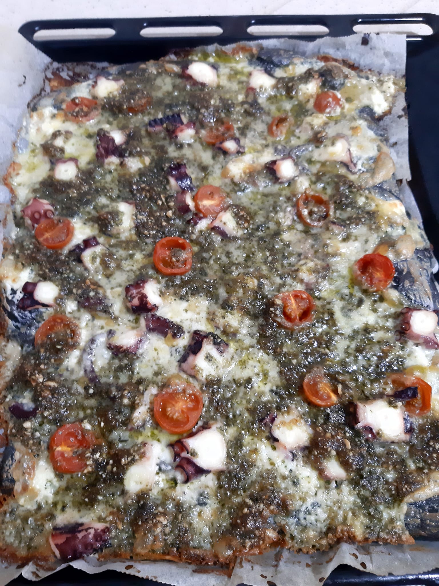 Pizza nero di sepia con pulpo y pesto de almendra con thermomix