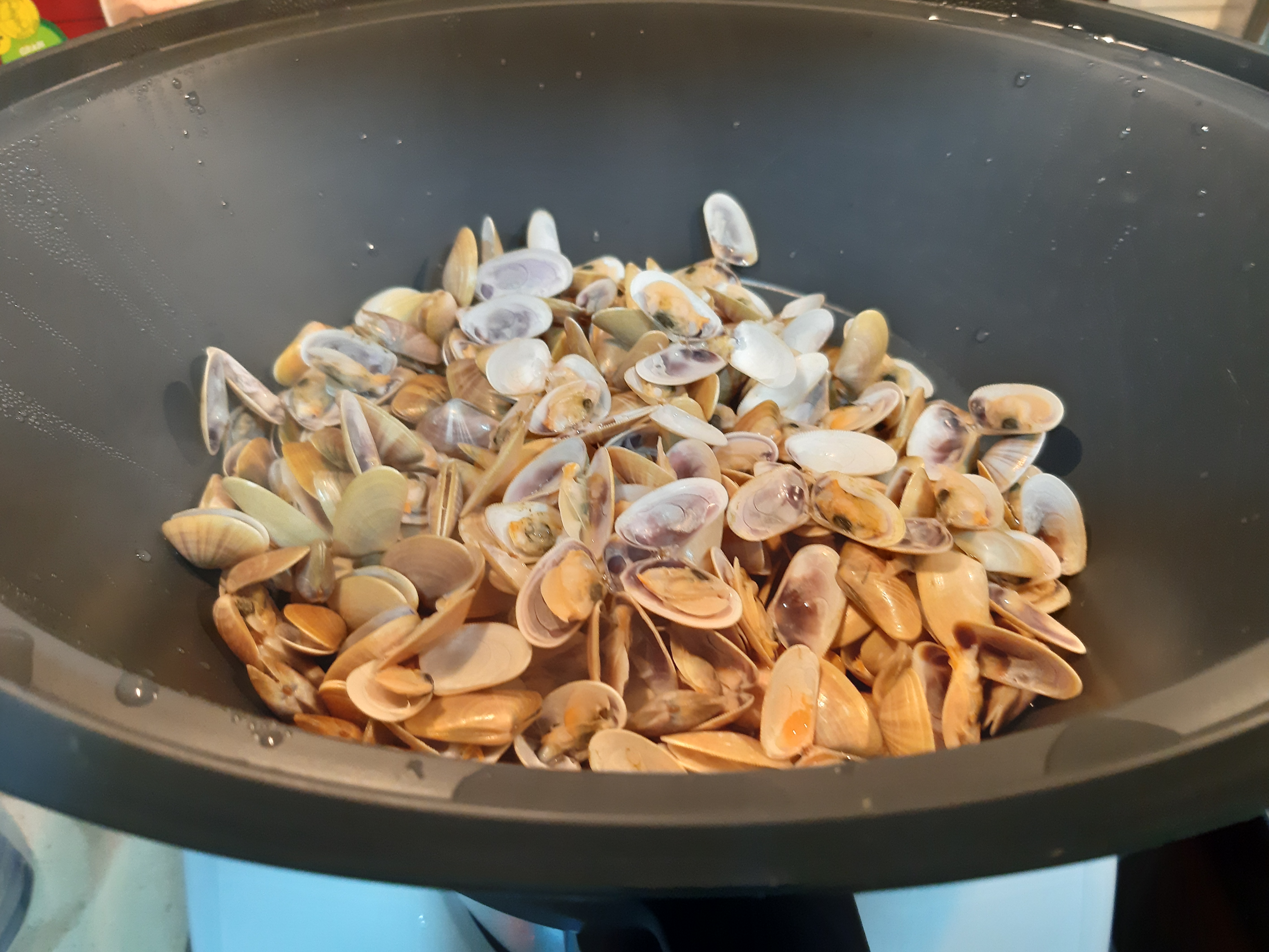 En el recipiente Varoma ponemos las coquinas que previamente las hemos tenido en agua con sal para quitarles la posible arena que traigan. Le ponemos la tapa y programamos el thermomix 15 min/Varoma C/giro inverso/ vel cuchara.