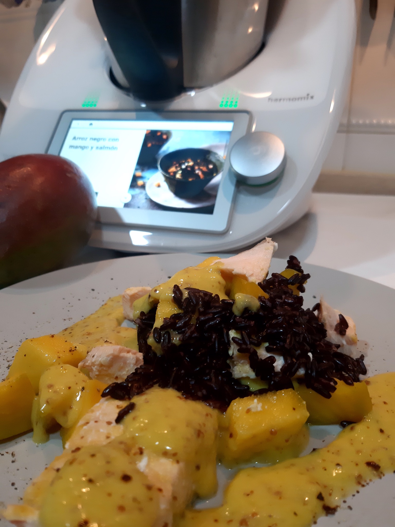 Arroz negro con mango y salmón