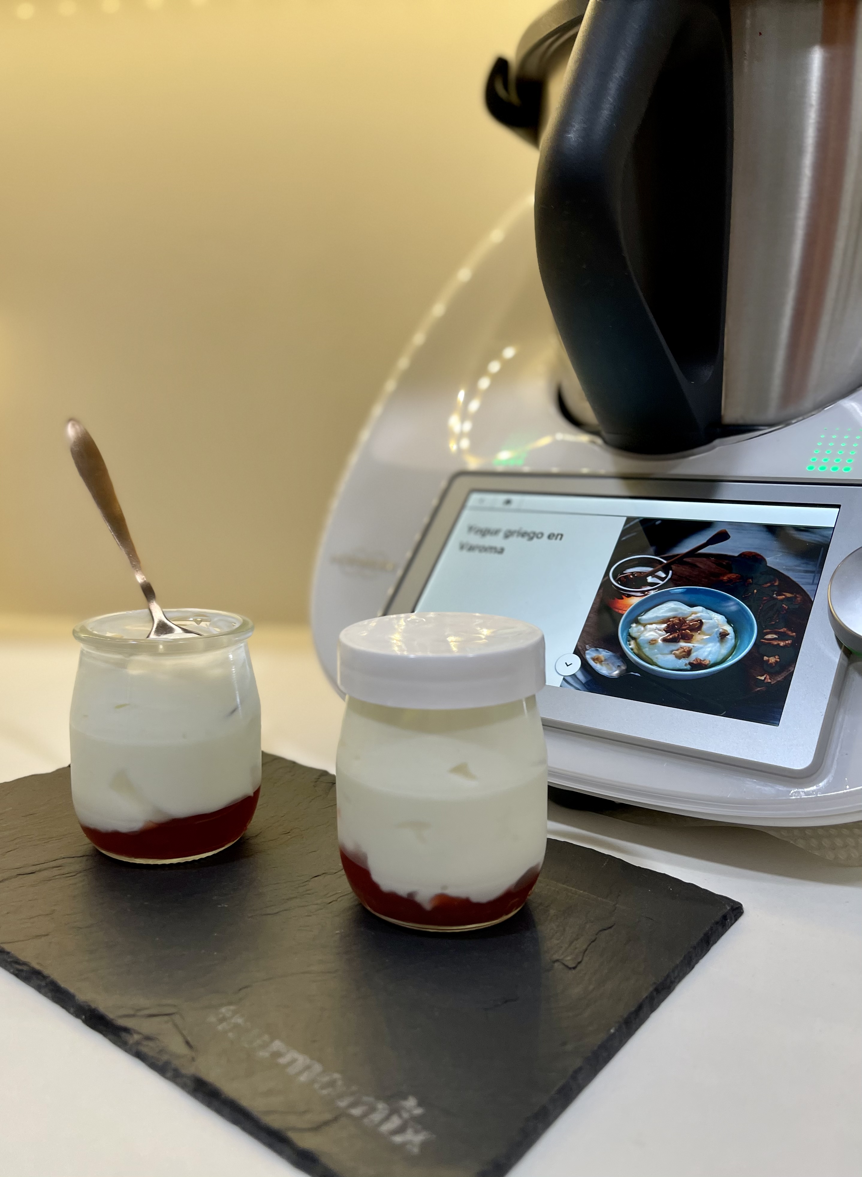 2. Coloque el vaso en la máquina, añada el yogur griego y la nata y mezcle 30 segundos/velocidad 3.5. Reparta la mezcla en los vasos para yogur, cierre sus tapas o cubra con film transparente. Colóquelos en el recipiente Varoma, tape y reserve. Aclare el vaso.