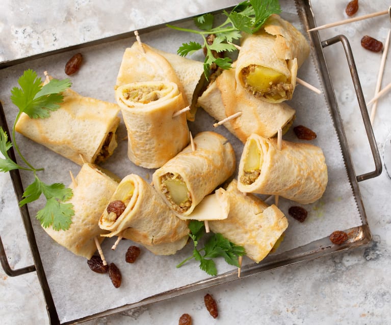 Extienda dos cucharada del relleno en cada crêpe y enrolle. Corte en rodajas de 2-3 cm y pinche con los palillos. Sirva acompañados con chutney de mango.