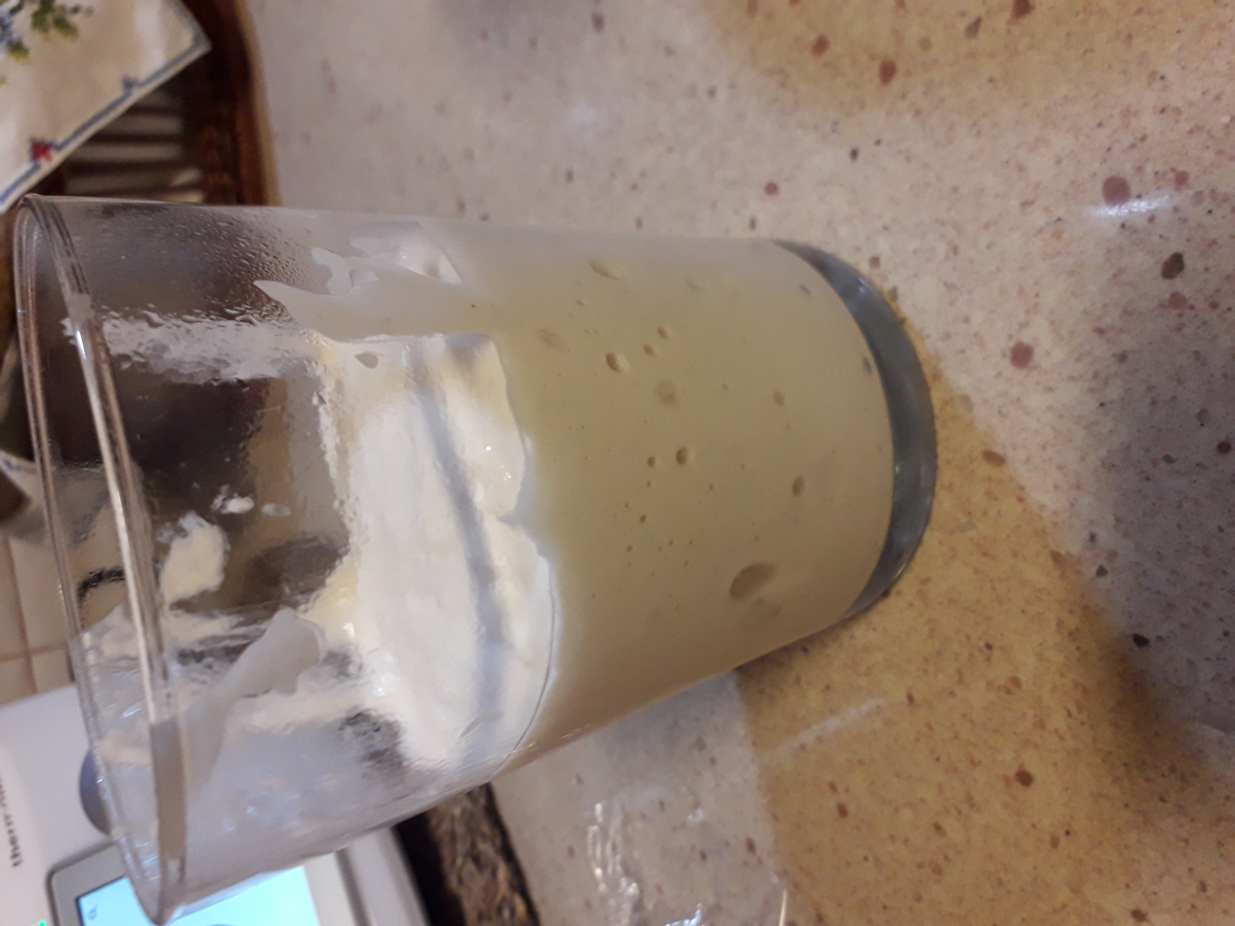 1 Echar al vaso la harina, el agua y la levadura, mezclar 5 segundos a velocidad 4. Baja los ingredientes con la espátula . Repetir, 5 seg/vel.4. Tapamos con papel film y dejamos a temperatura ambiente hasta que aparezcan burbujas, y reservamos en el frigorífico. Lo sacamos unas 3 horas antes de utilizar.
