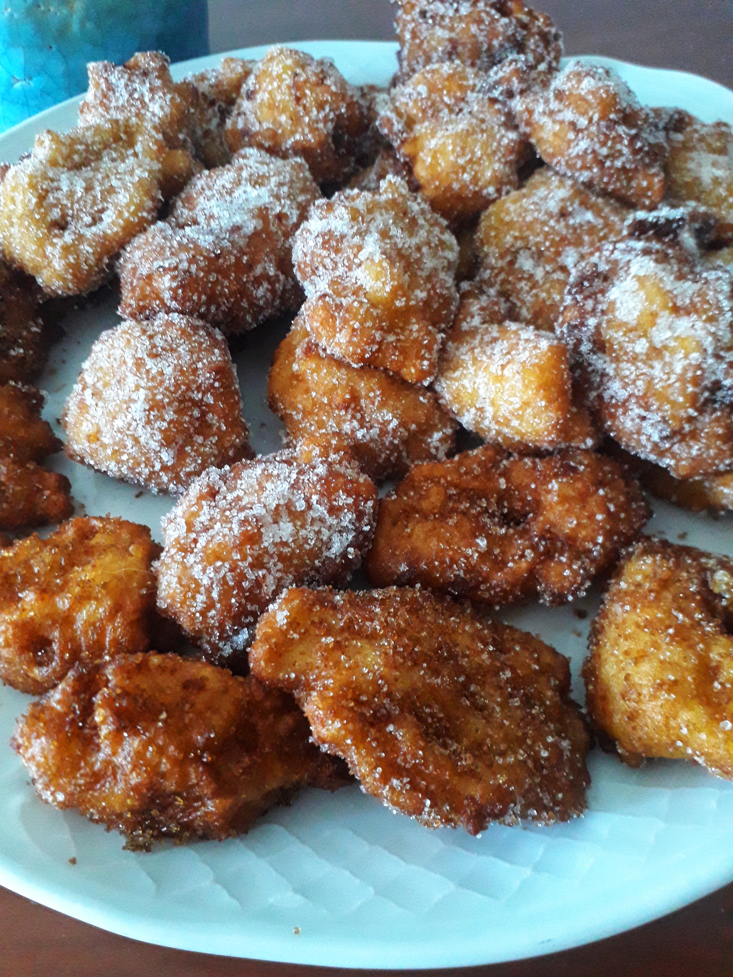 Fría pequeñas porciones de masa por tandas en abundante aceite caliente y retire sobre papel de cocina. Reboce los buñuelos en azúcar moreno o en azúcar blanca y sirva templados.