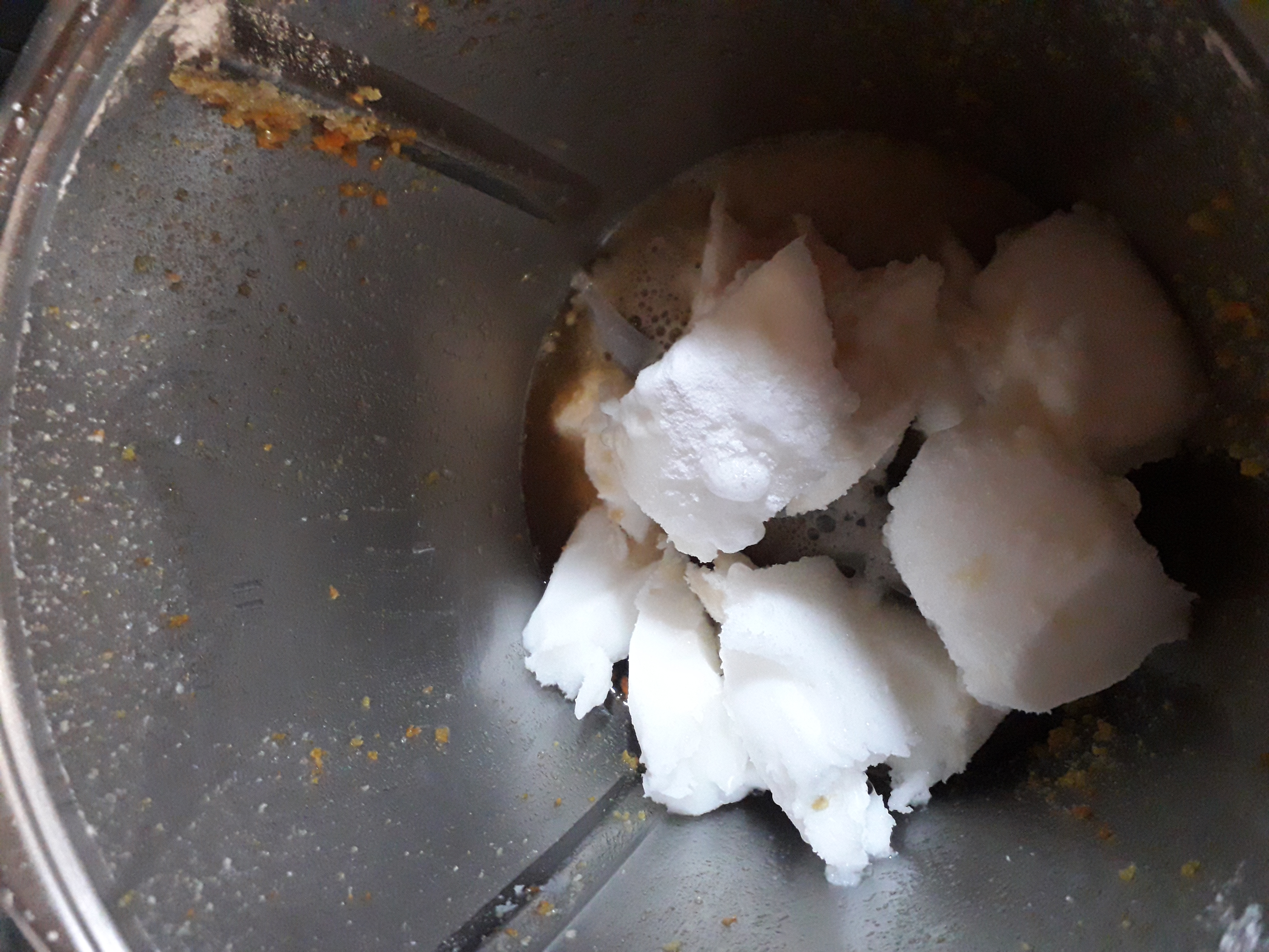 Ponga en el vaso las pieles de naranja y 30 g de azúcar. Pulverice 15 seg/vel 10. Con la espátula, baje los ingredientes hacia el fondo del vaso y pulverice 10 seg/vel 10.