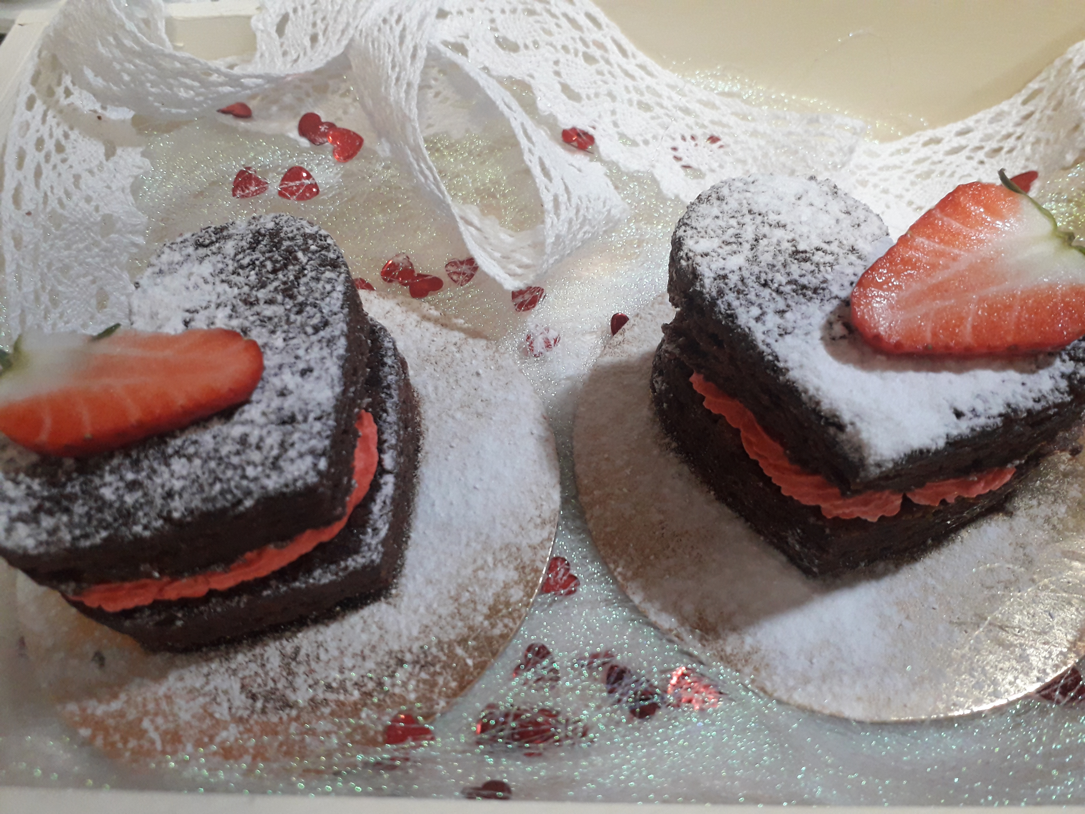 10. Con un cortador de galletas en forma de corazón, corte 14 corazones del pastel. Cubra la mitad de ellos con crema de fresa, luego ciérrelos colocando los corazones restantes encima.