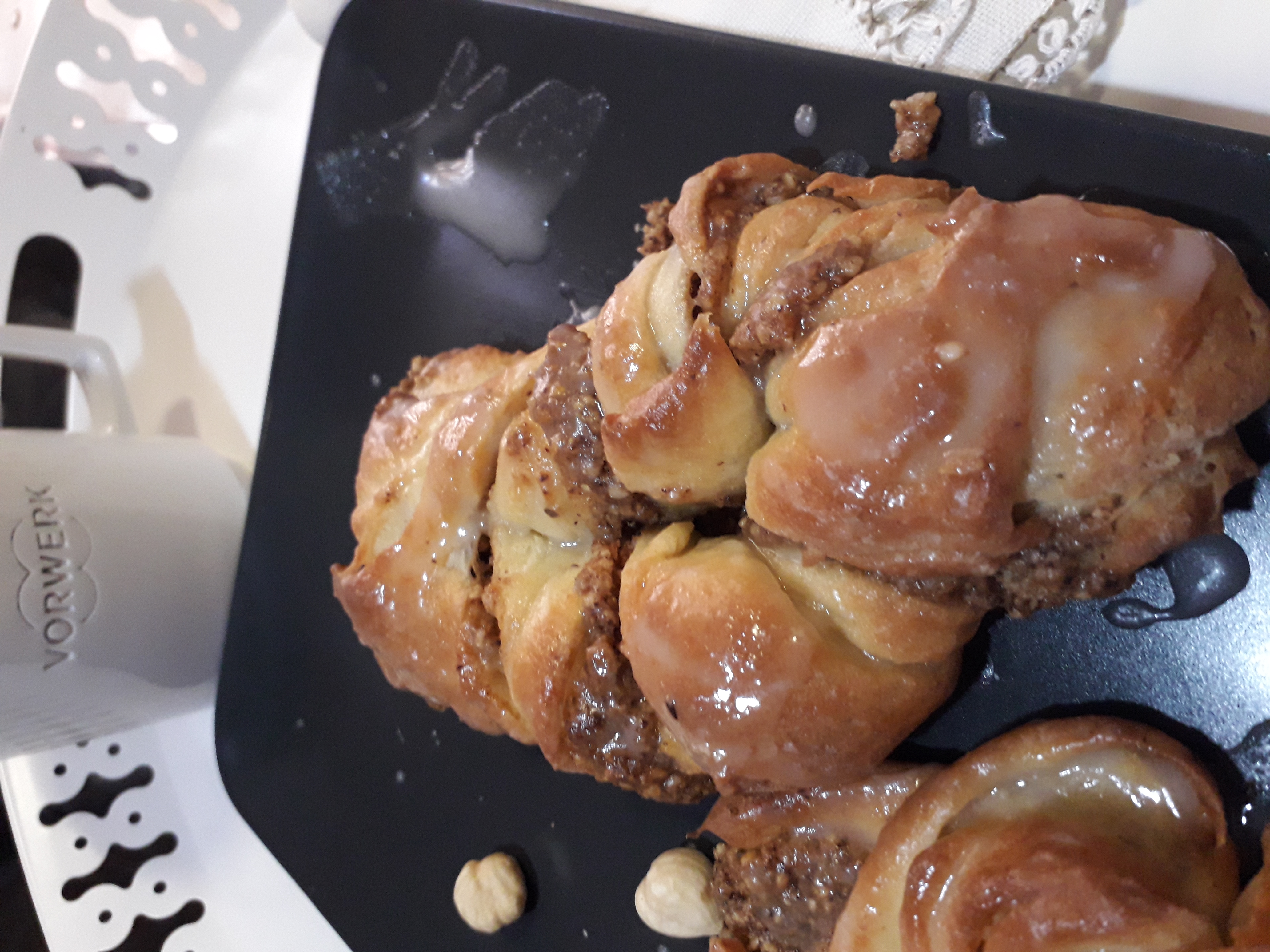 Coloque las trenzas en las bandejas preparadas y hornee (200ºC) en 2 tandas de 12-14 minutos. Retire del horno y hornee la siguiente tanda. Pincele las trenzas aún calientes con el glaseado. Deje enfriar y sirva