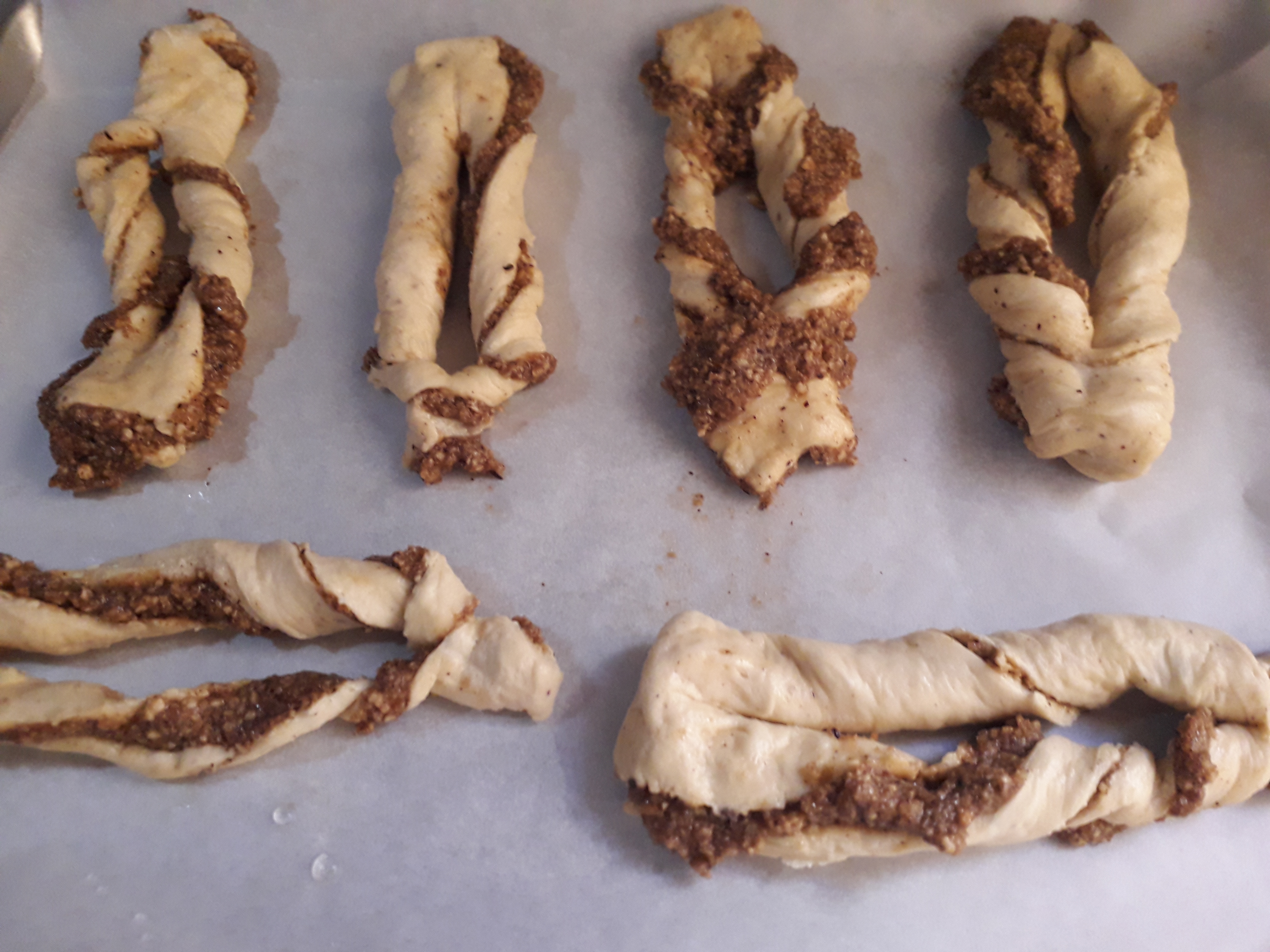 Extienda de nuevo la masa en un rectángulo de 30x60 cm y unte la mitad del relleno sobre la mitad de la masa a lo largo. Doble encima la otra mitad de la masa y selle bien los bordes. Corte la masa en 15 tiras de 4x15 cm y corte un ojal de 9 cm en el centro de cada tira. Forme cada trenza haciendo pasar la masa de un extremo del bastón dos veces por el ojal.