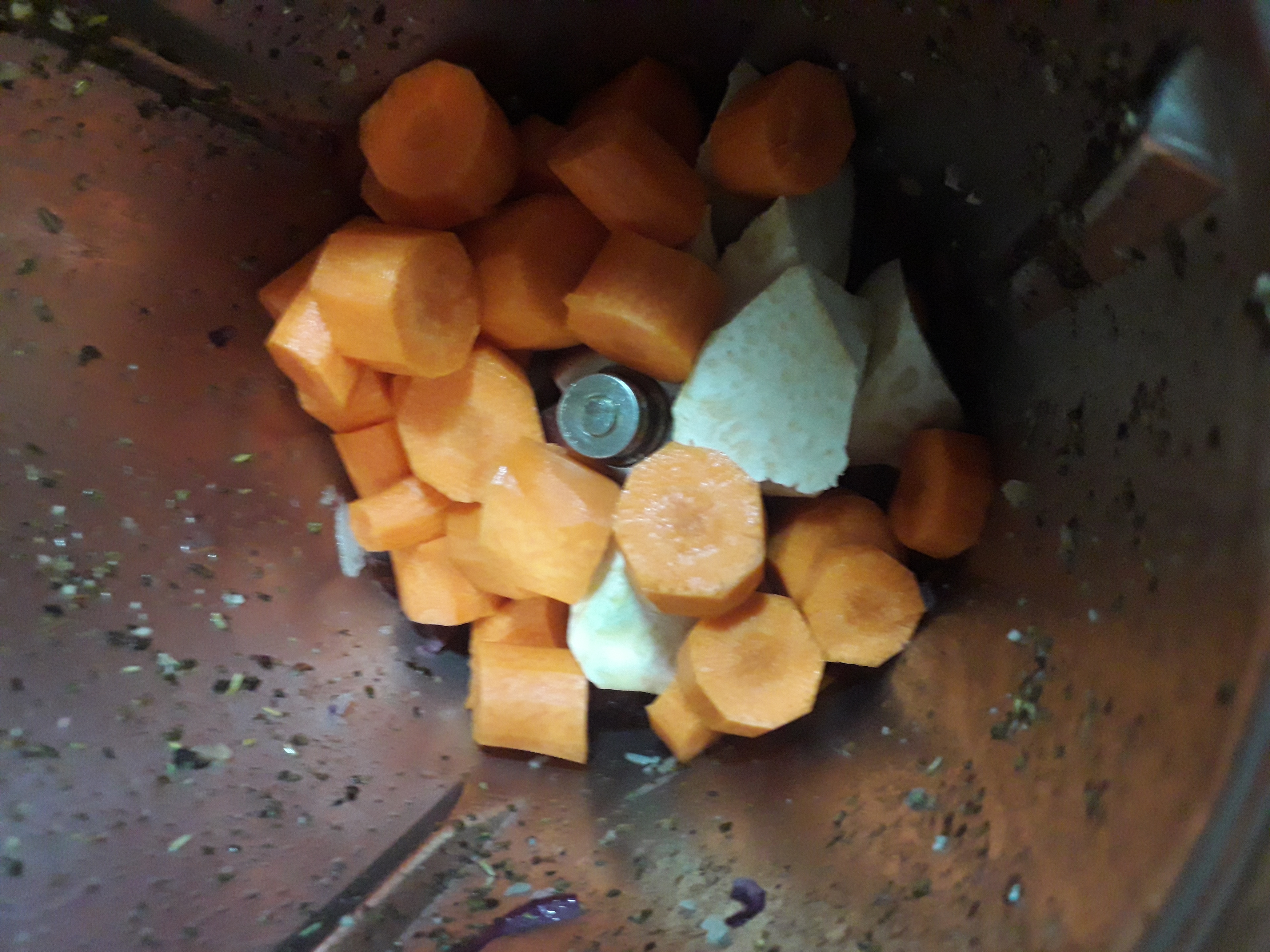 Añada el apio nabo, la zanahoria, la sal y el agua y programe 25 min/100°C/vel 1.