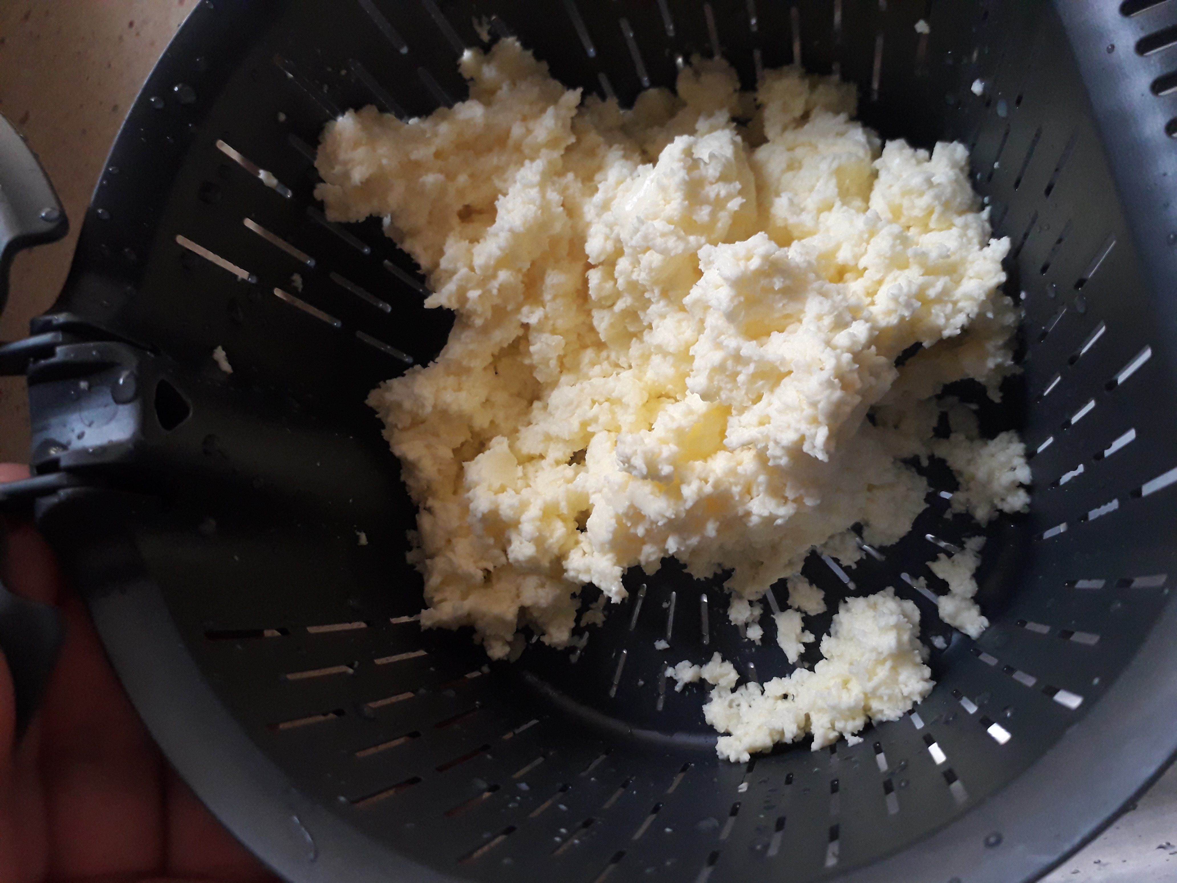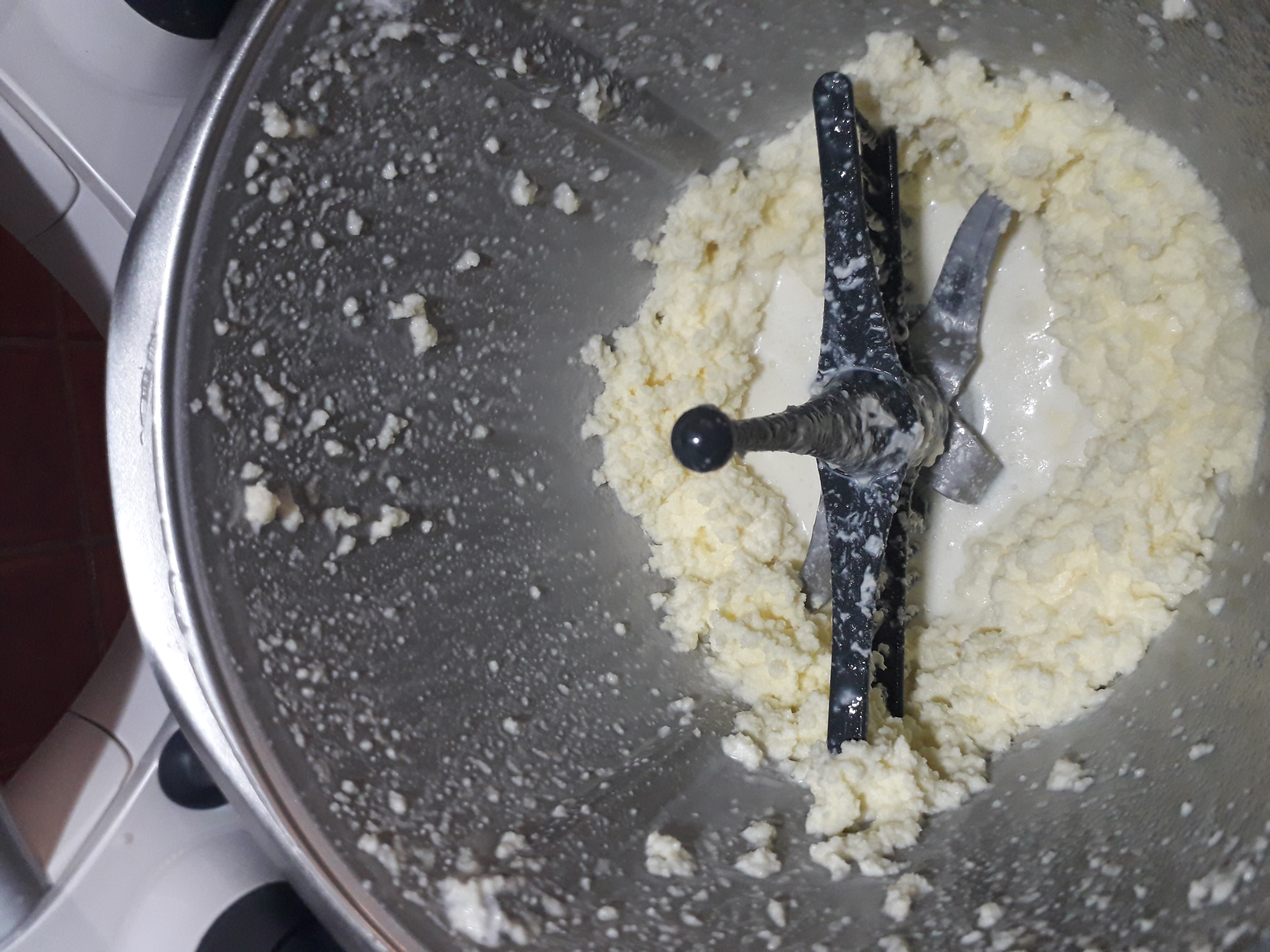 seguimos montando, hasta que conseguir este resultado, se ha separado el suero de la grasa de la leche.