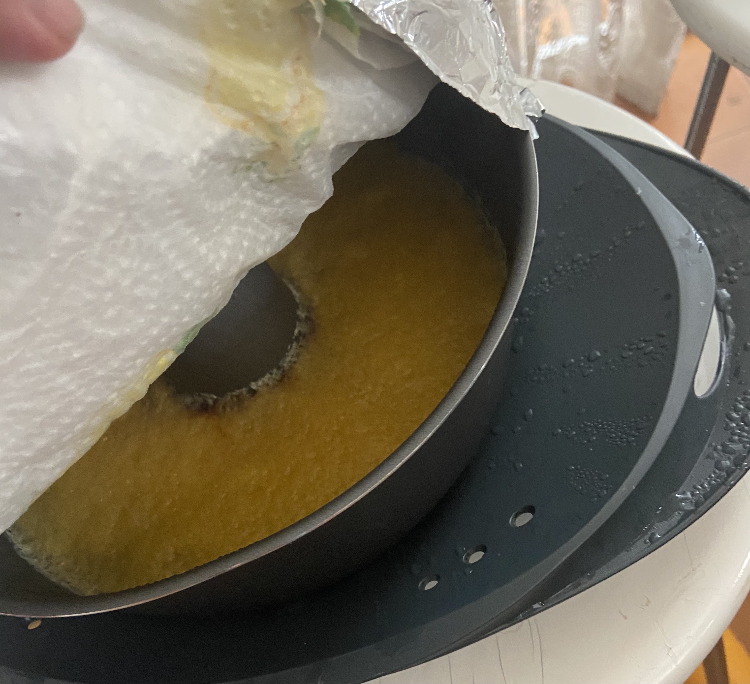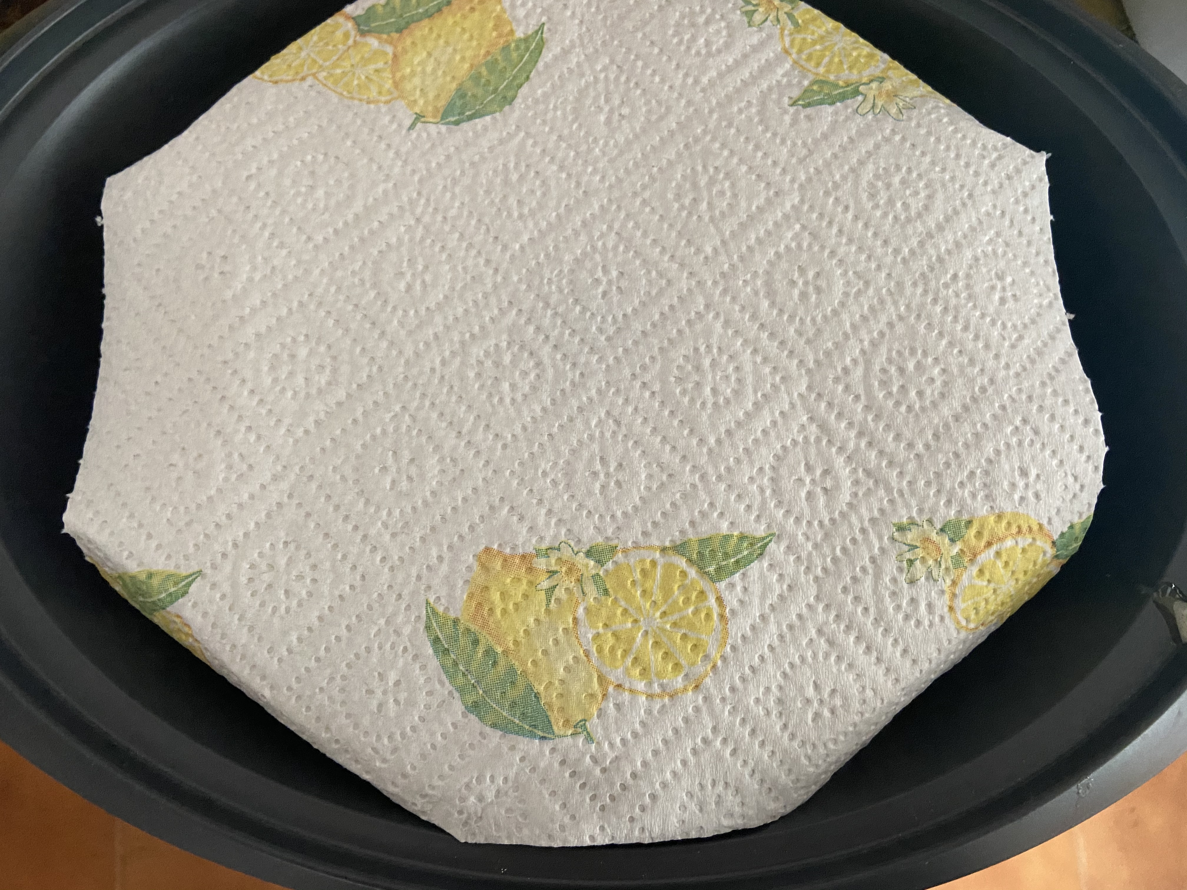 - Tapa con primero con papel de cocina y encima del papel de cocina cubre también con papel de aluminio, pon la tapa del varoma.