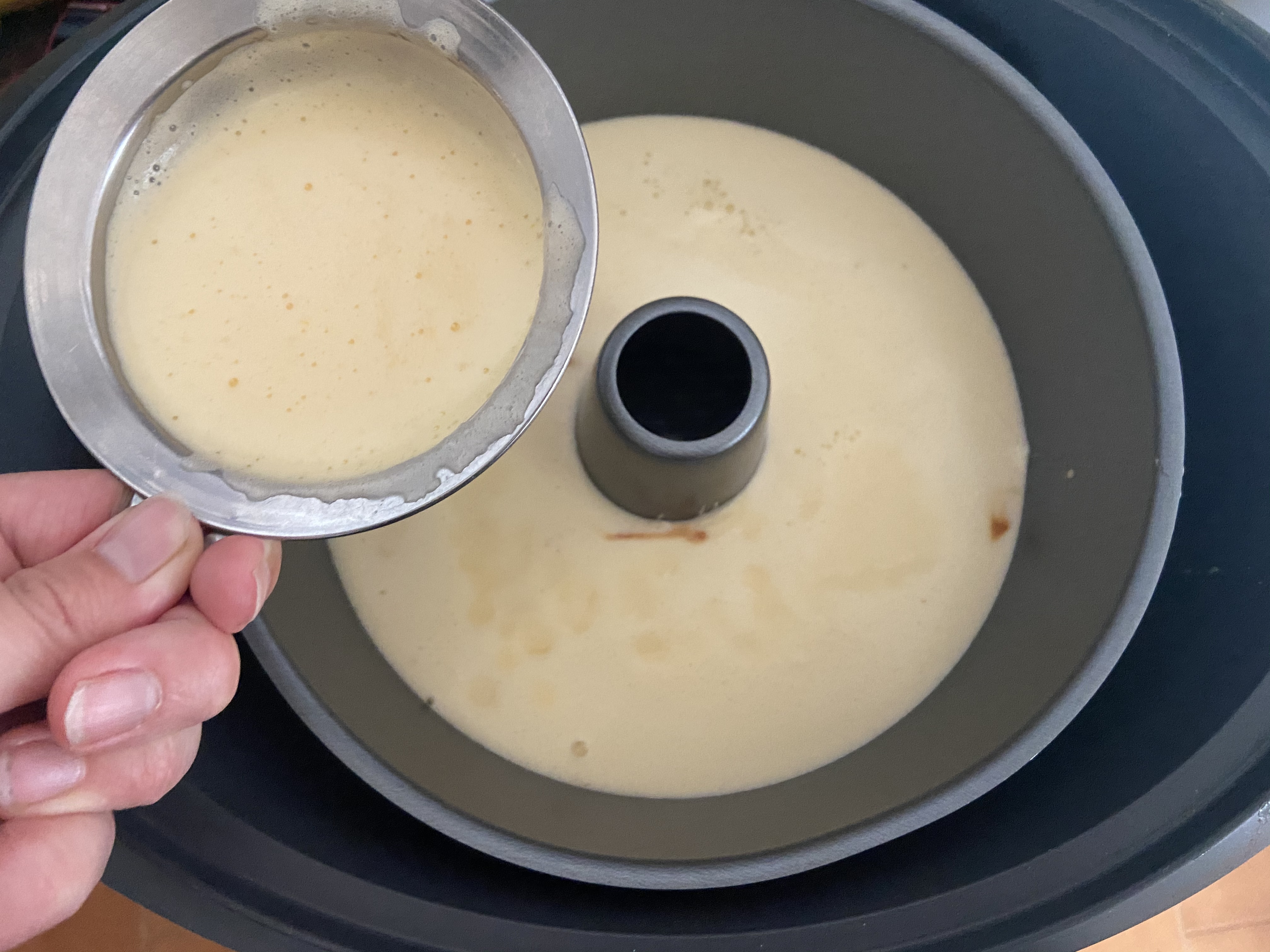 - Al finalizar, vierte la mezcla sobre el caramelo pasándola por un colador.