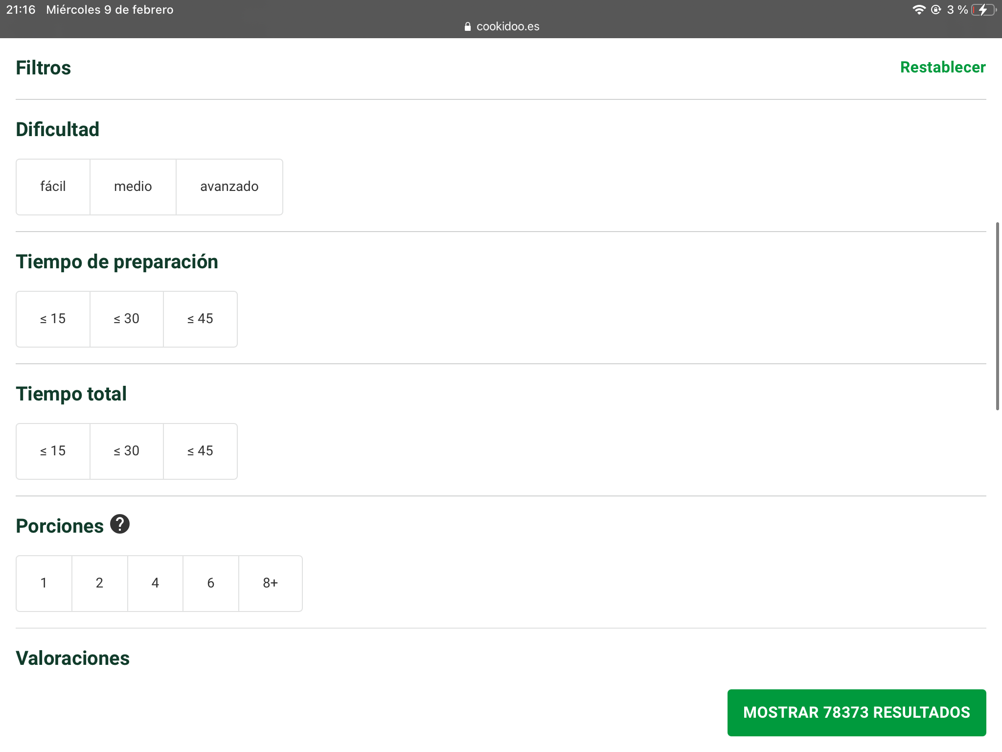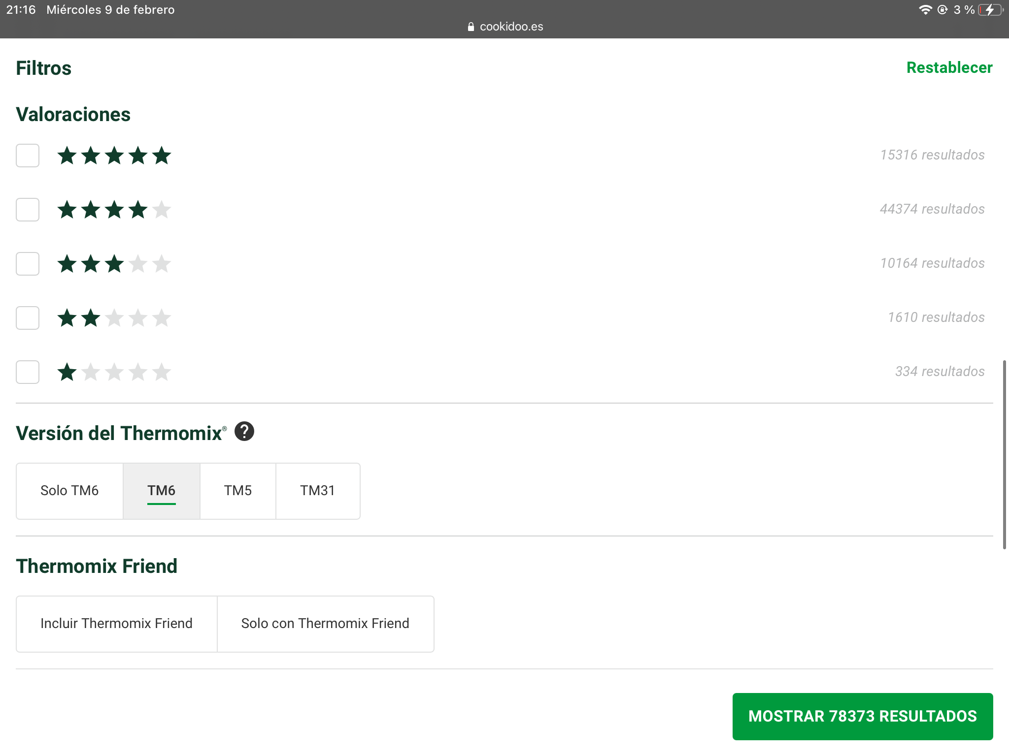 Puedes clasificar por categoría del plato (entrante, plato principal, postre…) excluir o buscar ingredientes, filtrar por tiempo que necesitas invertir en su preparación, por dificultad, por el modelo que tienes en casa… incluso por países si quieres buscar recetas de otros lugares!