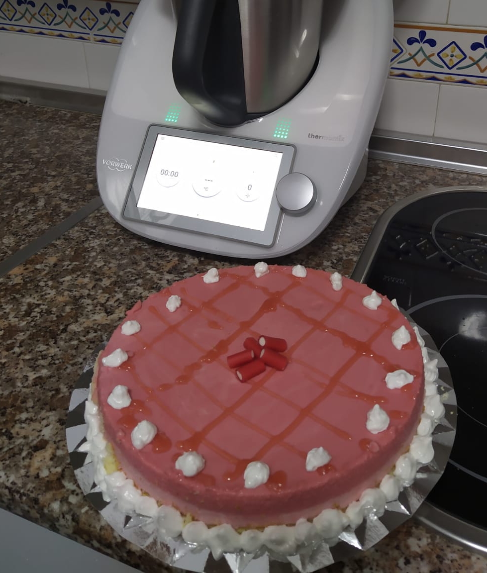 Agregue la leche, la nata y las hojas de gelatina hidratantes y recurrida.programe 6 min / 90° C /vel 4 . Mientras tanto , coloque la plancha de bizcocho en la base de un molde desmontable ( 22 cm ) bien ajustado en la base ( para evitar que se salga el relleno y reser3.