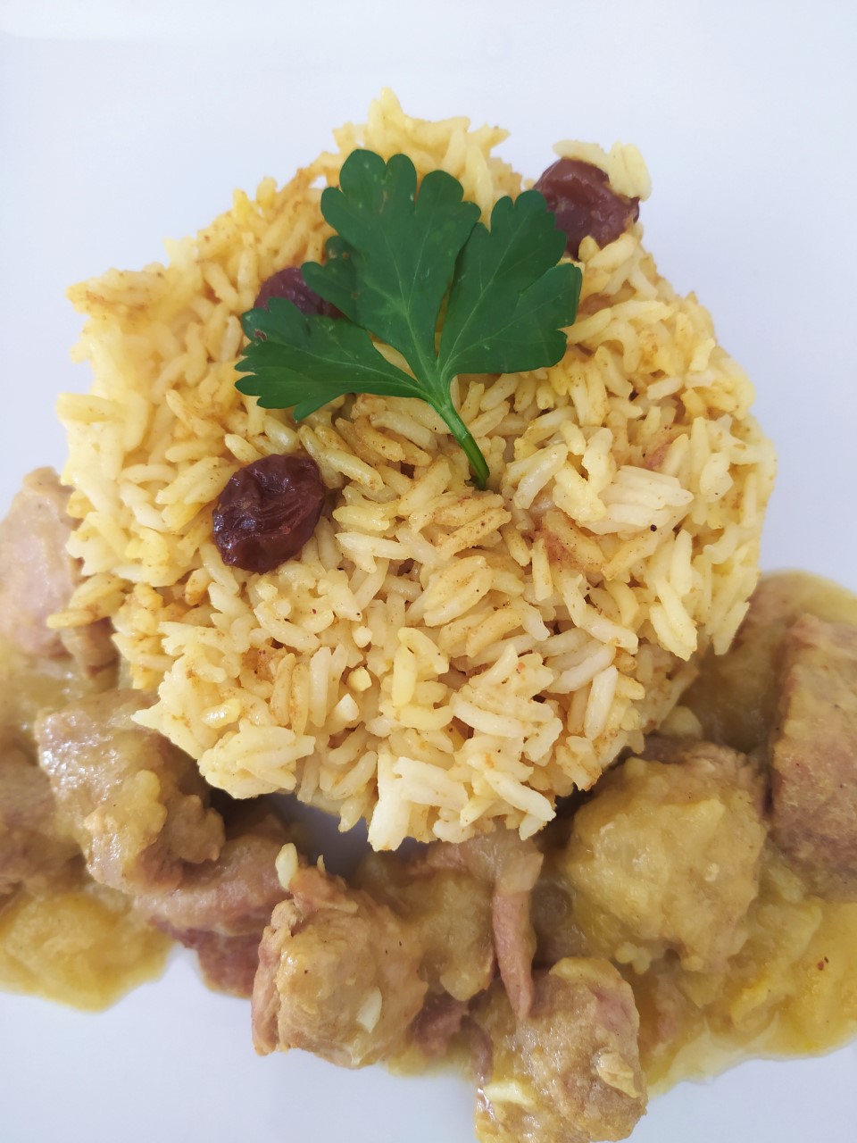 1º Ponga en el vaso el ajo, el agua, la sal, el aceite y el curry. Triture 15 seg/vel 6. Sitúe el recipiente Varoma en su posición con la bandeja Varoma. Cubra la bandeja Varoma con un trozo de papel de hornear mojado y escurrido (aprox. 30x40 cm). Ponga encima el arroz y las pasas. Retire el recipiente Varoma y vierta el líquido del vaso sobre el arroz y las pasas, tape el Varoma y reserve.