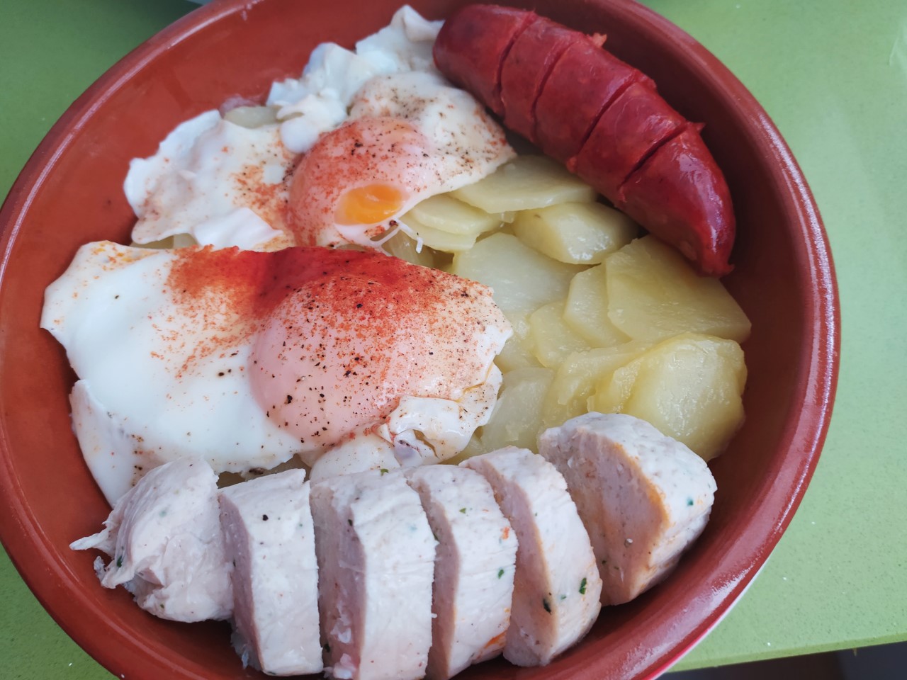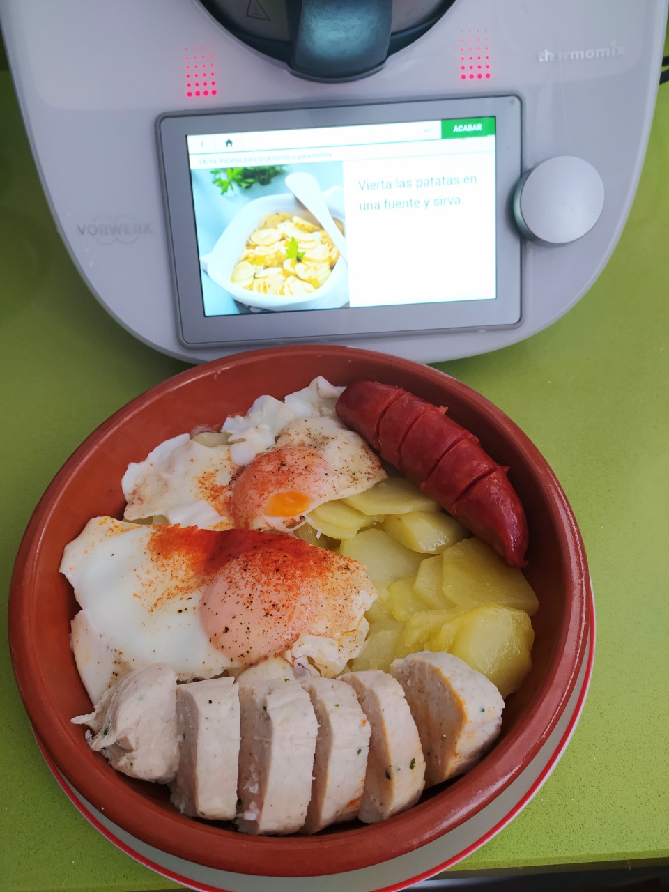 PATATAS DE GUARNICIÓN CON HEVOS AL VAPOR Y SALCHICHAS POLLO