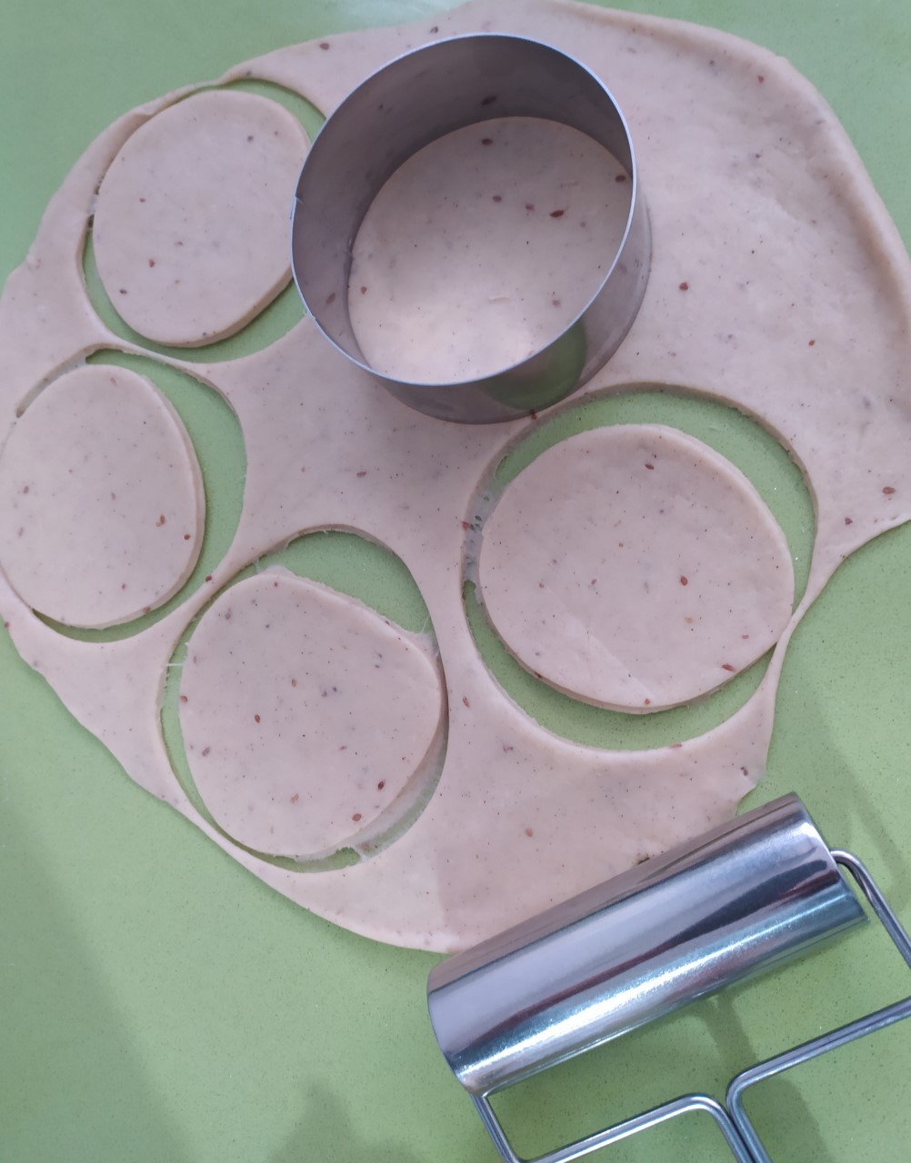 2º Vaciar la masa a una mesa de trabajo, estiramos con el rodillo, hacer círculos con ayuda de un aro de emplatar o un vaso.