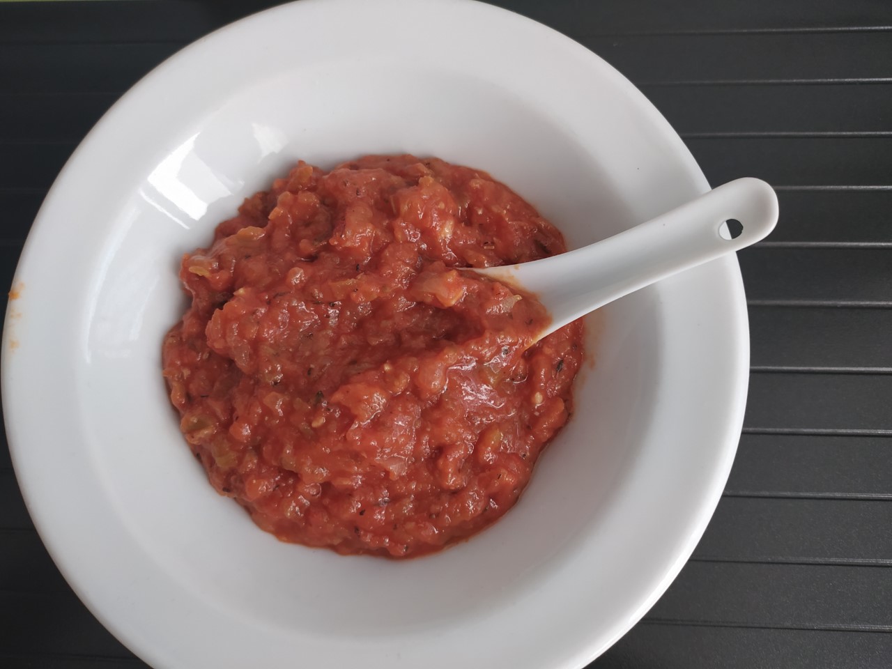 3.- A continuación se le echa el tomate, azúcar, las especias y la sal y programamos 20 min./Varoma/giro inverso/Vel 1. Finalmente trituramos 2 seg/vel 5. (Si os gusta con menos trocitos dar unos segundos más) guardar en un bote de cristal.