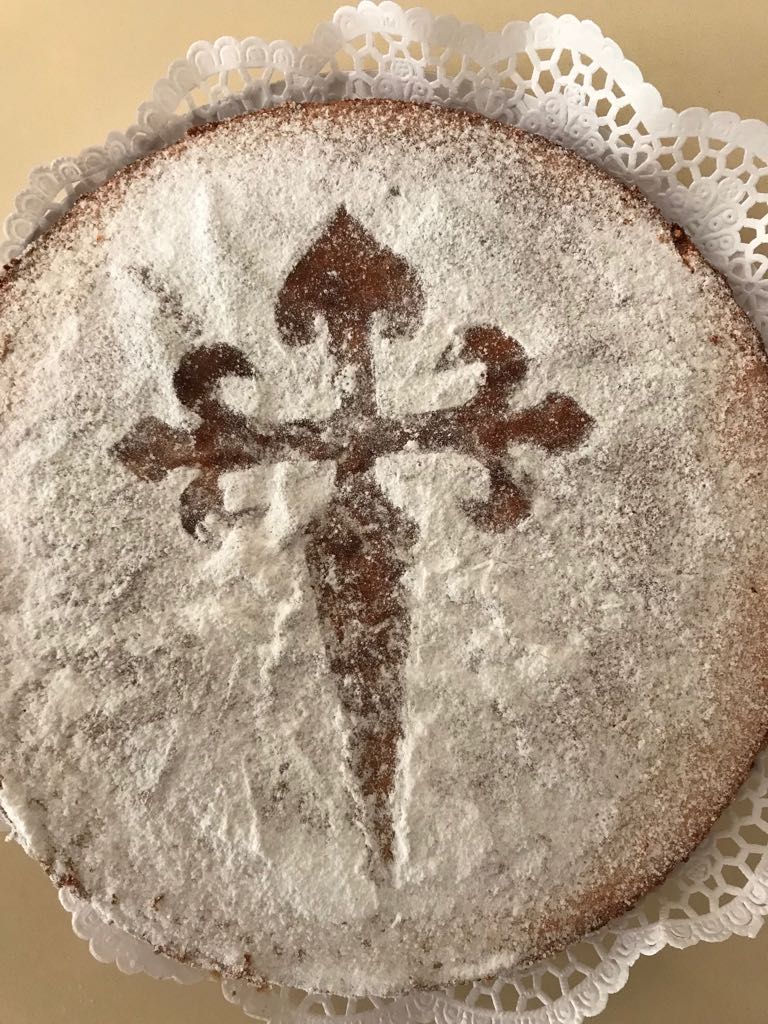 Decore la tarta poniendo la silueta de la Cruz de Santiago en el centro y espolvoree toda la superficie con el azúcar glass.