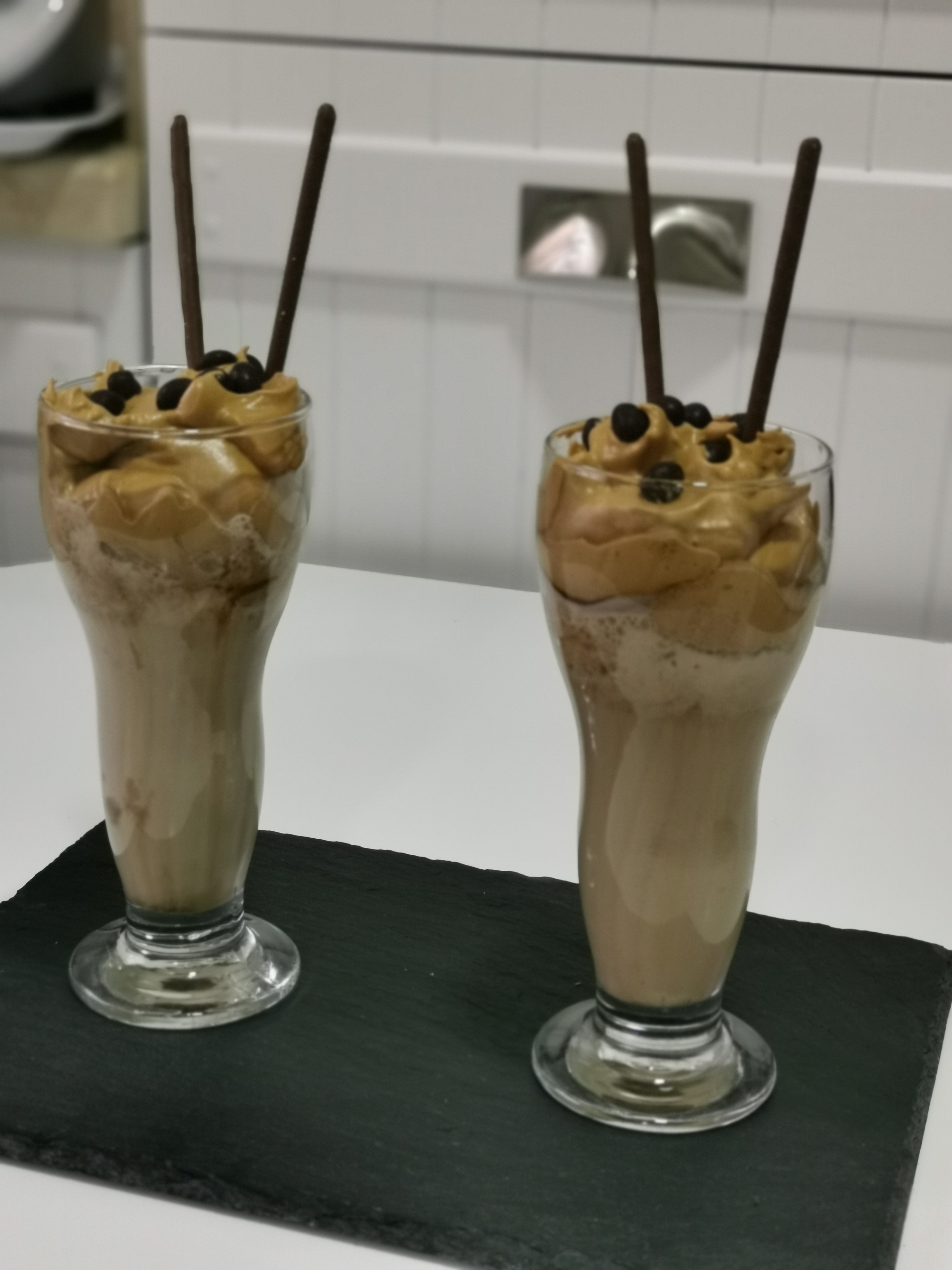 Se trata de un cafe muy especial cafe dalgona, acompañado de helado y licor.