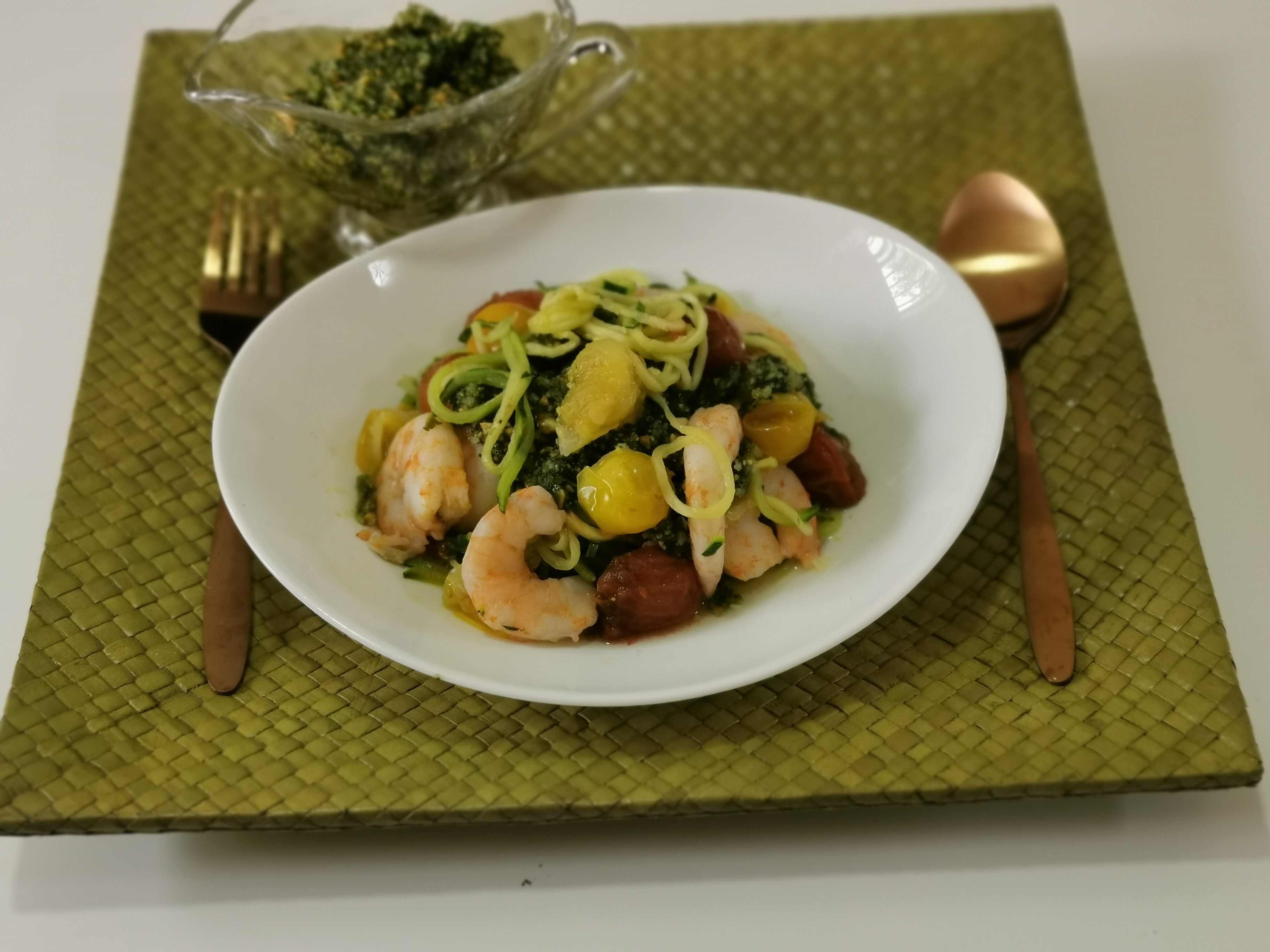 Spaguetis de calabacin con gambas tomate cherry y pesto de almendra