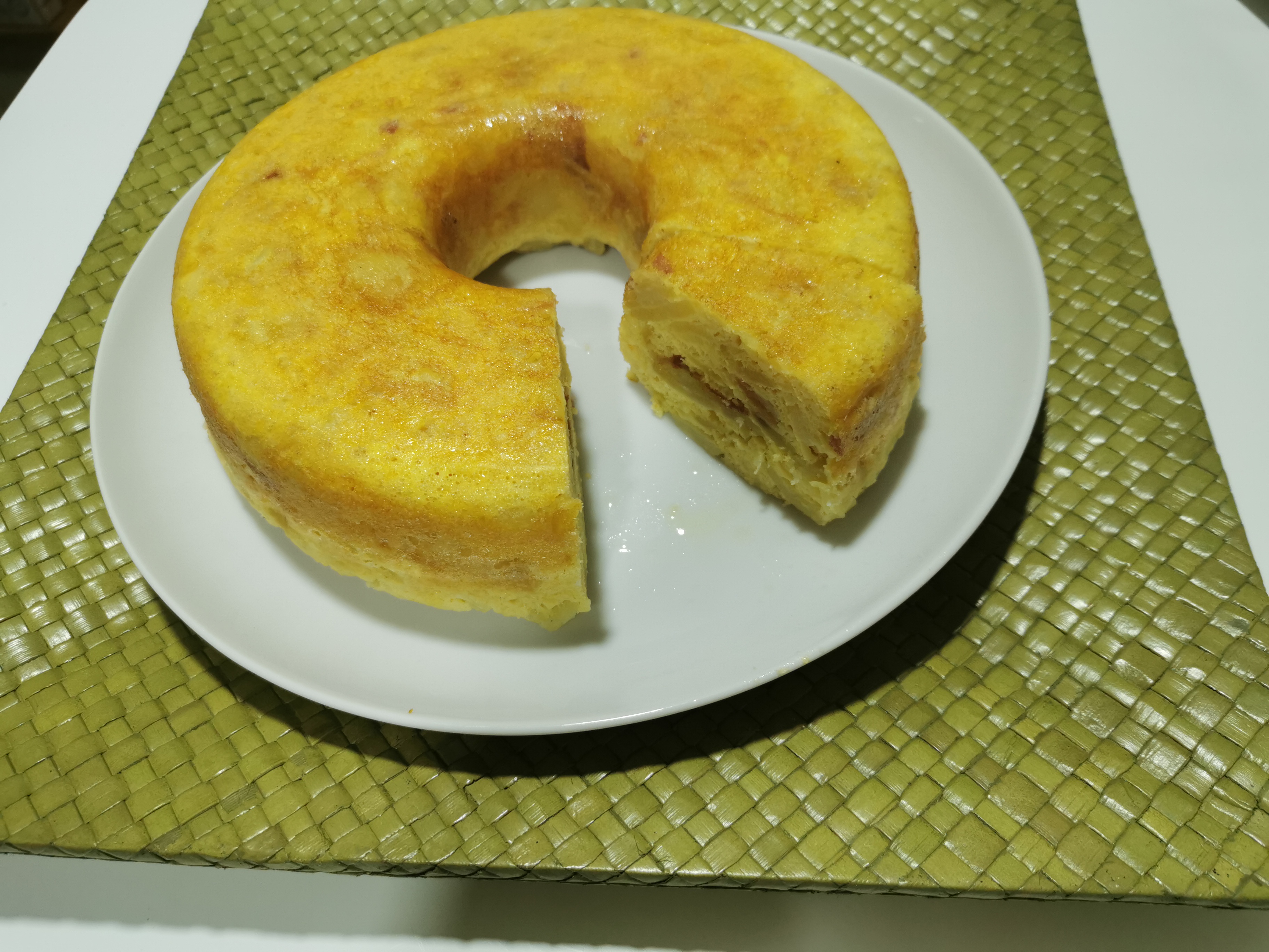 En una sarten dore los ajos y el beicon y mezcle al bol de las patatas con el huevo, poner en un molde (esta es de bizcocho) qué quepa en varoma prgramar 40 min/ varoma vel 1.
