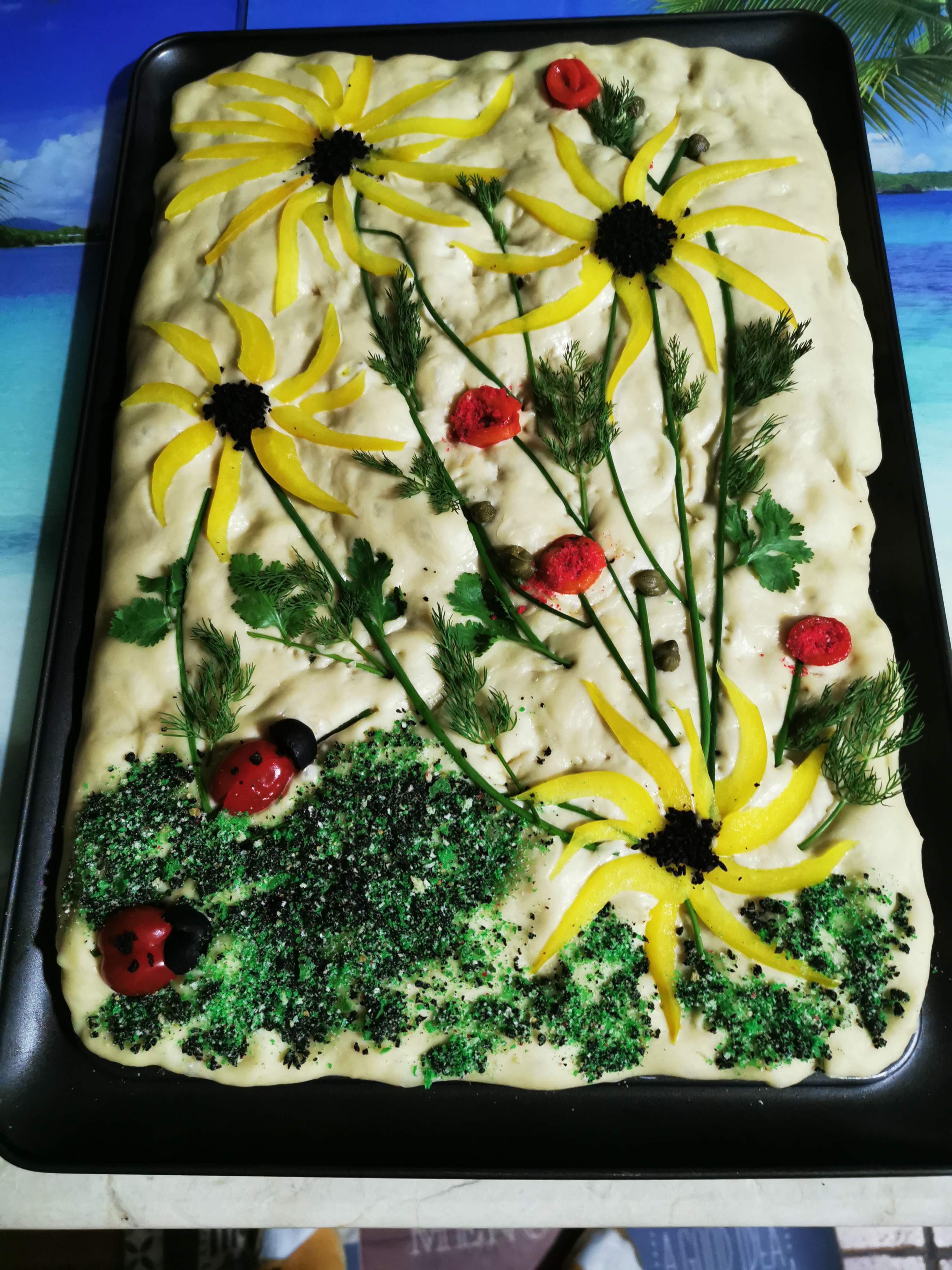 Bueno he participado en un reto de #arteconthermomix, y he hecho esta maravillosa focaccia, me ha encantado participar. La masa de la focacia es una masa muy blanda, de hecho al principio hay que dejarla levar bastante hasta que se hace masa blanda, se unde con los dedos y se le pone aceite de oliva, y ya puedes dejar tu imaginacion volar como esta que he hecho con girasoles y mariquitas. Si queréis saber algo más os pongo mi teléfono 645920587. Soy Milagros Acal. EXPORTAR LA RECETA A TU COOKIDOO®