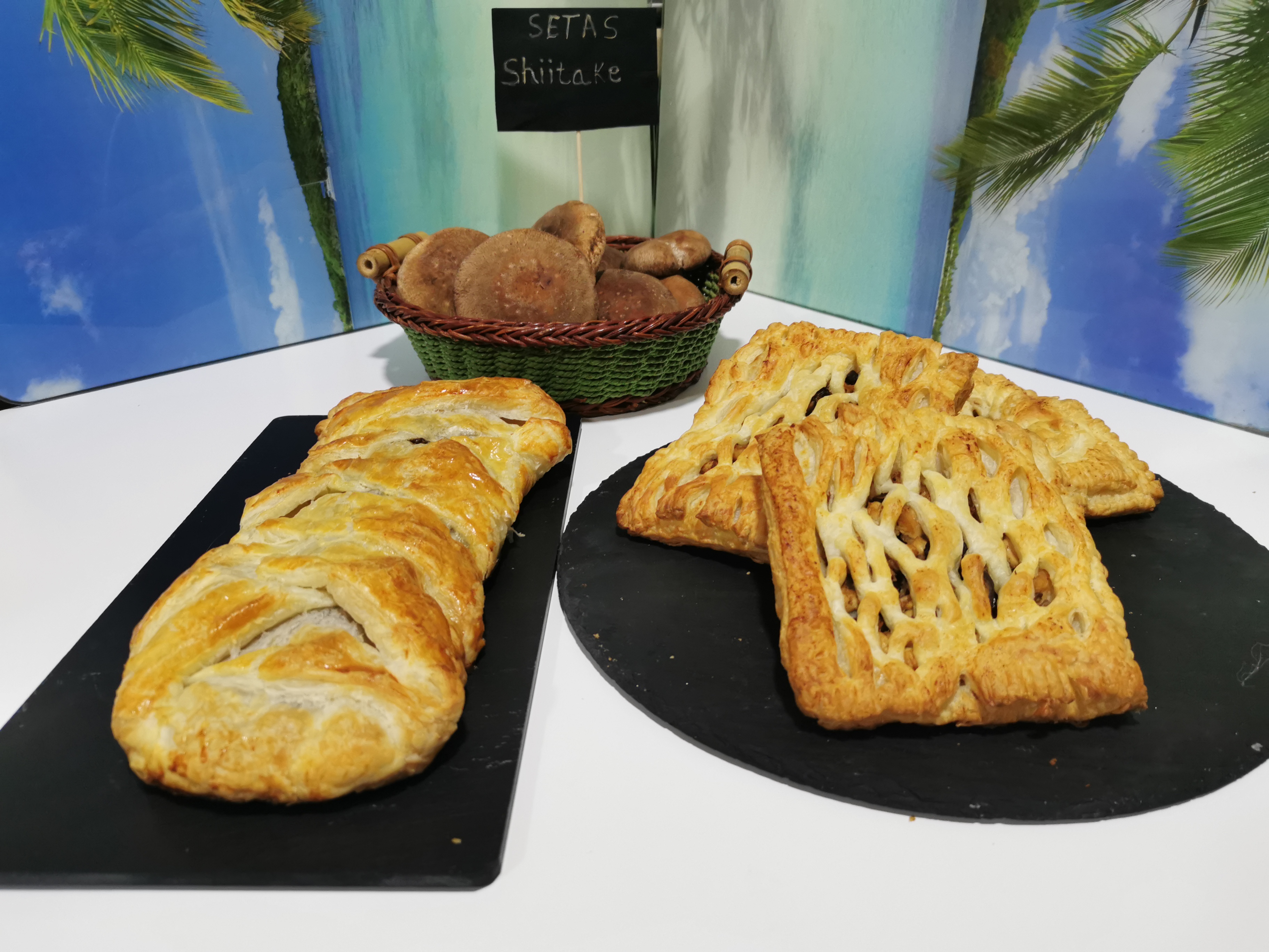 Trenza de hojaldre con setas, pollo, y cebolla caramelizada
