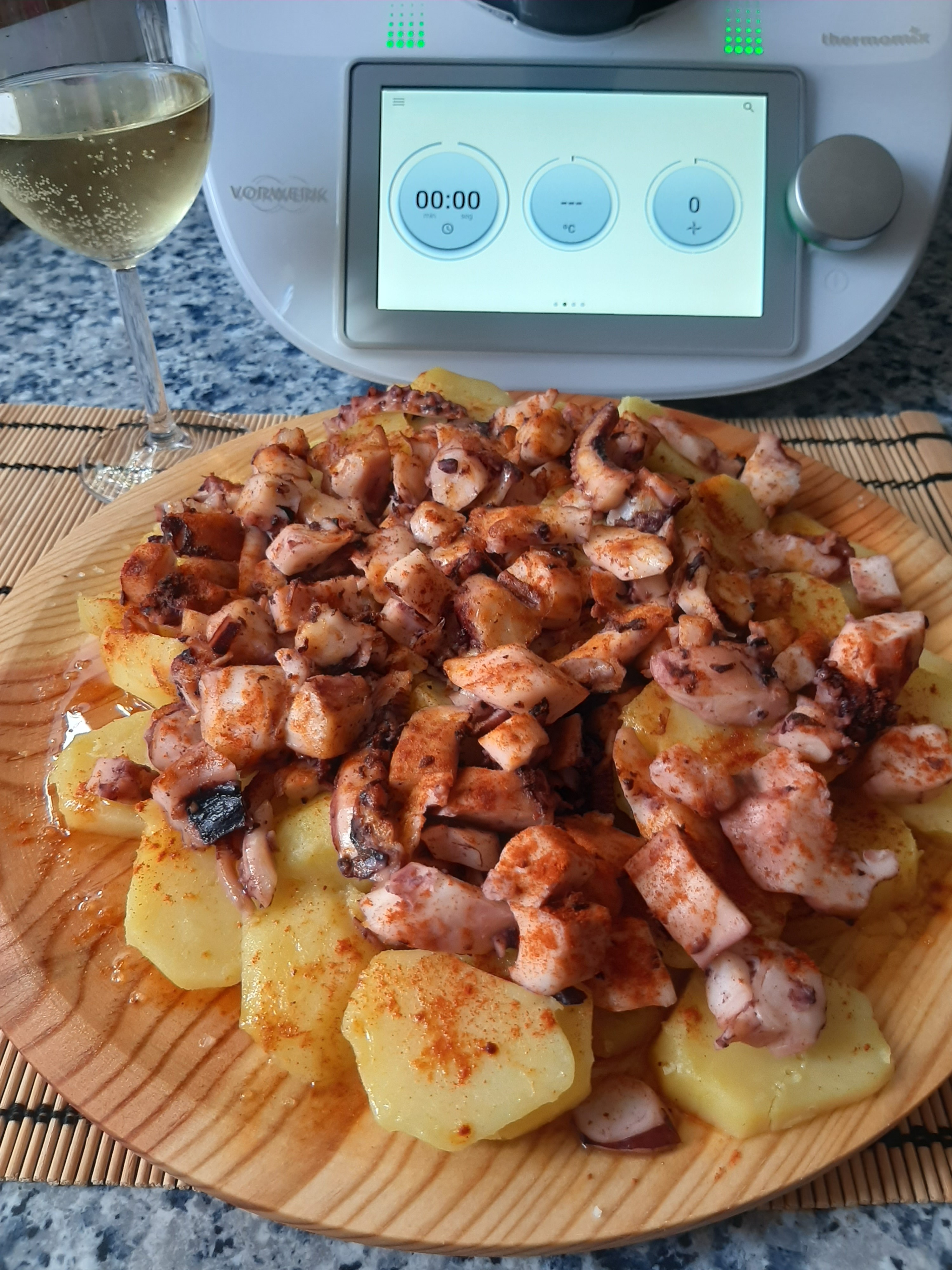 3.-Una vez terminado el tiempo sacamos el cestillo del vaso con ayuda de la espátula. Colocamos las patatas en un plato de madera o fuente y el pulpo sobre ellas, le añadimos la sal, el aceite y pimentón al gusto.